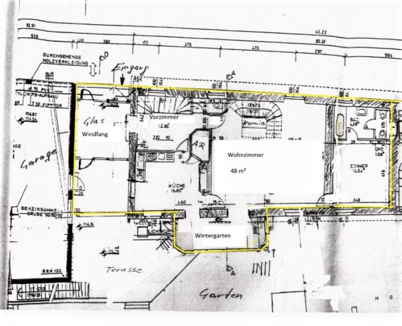 Erdgeschoss: Windfang, Vorzimmer, Wohnzimmer, Wohnküche mit Speisekammer, Wintergarten,