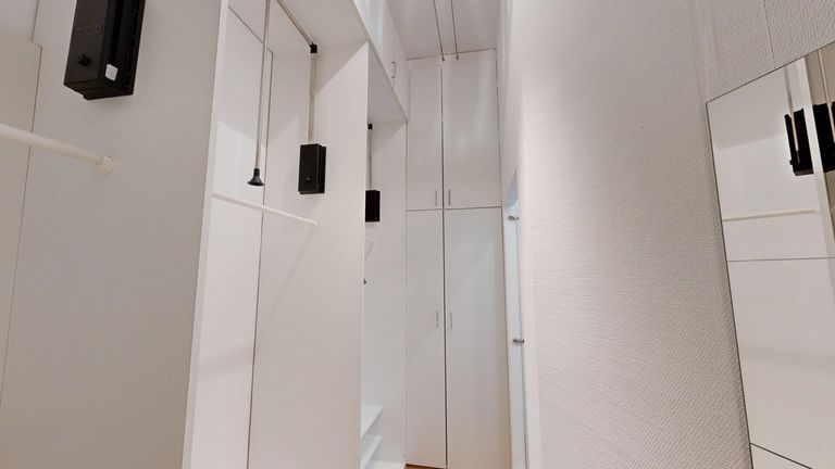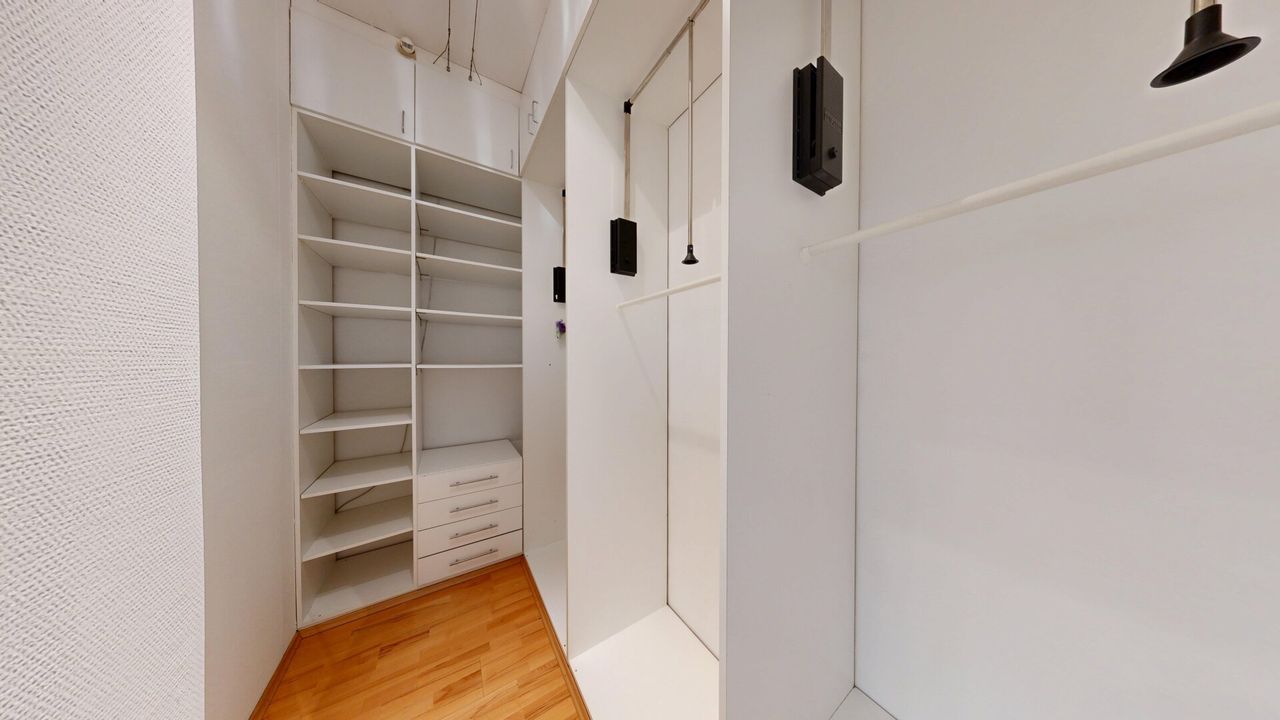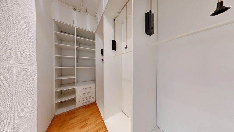 Ein besonderes Highlight verbirgt sich im Schlafzimmer: Eine unscheinbare Tür öffnet sich zu einem geräumigen, begehbaren Kleiderschrank – ein echtes „Geheimversteck“ und außergewöhnliches Highlight dieser Wohnung.