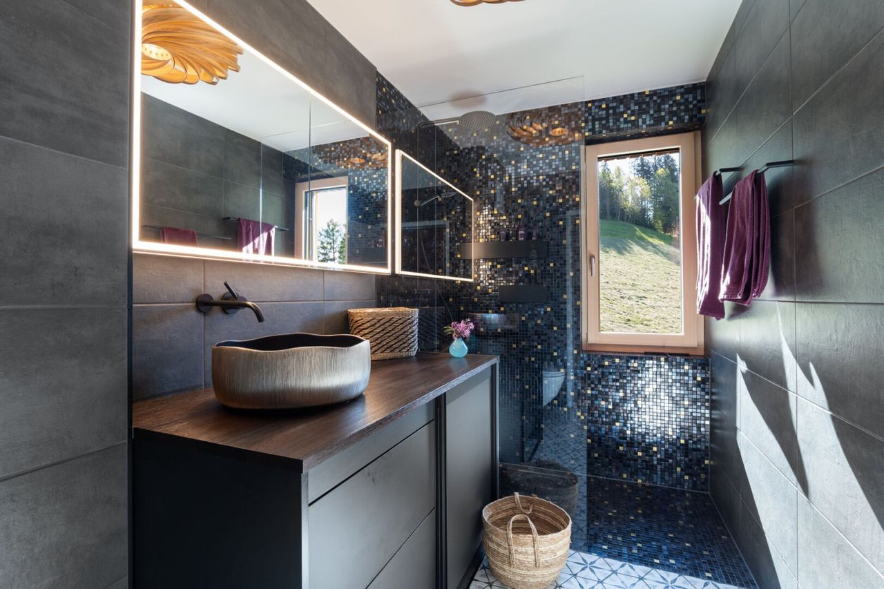 • Stilvolle Fliesen im Bad: Mosaikfliesen Bisazza Tiana in der Dusche und elegante italienische Bodenfliesen