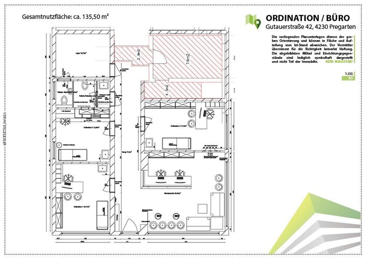 ORDINATION - THERAPIE - TRAINING - WELLNESS QUICKFACTS Nutzfläche gesamt: ca. 274,5 m² Raumaufteilung: laut Plan, veränderbar Stockwerk: EG, 1. OG Parkplätze: 4 inklusive, zusätzliche Parkplätze zu je € 30,00 netto monatlich anmietbar WC Anlagen: 4 Nettomiete / m²: ab € 8,50 Bezugstermin: nach Vereinbarung OBJEKTBESCHREIBUNG Diese sofort verfügbare Ordinations- oder Bürofläche ist unterteilt in eine ca. 135,56 m² ebenerdige Einheit und eine ca. 139 m² Einheit im 1. OG. Das Erdgeschoss wurde bisher als Ordination genutzt und verfügt über einen großzügigen Empfangs- und Wartebereich, 4 Ordinationsräume (mit Anschlüssen für Handwaschbecken), Sanitärräume und einen Labor/Lagerraum. Das 1. Obergeschoss erreicht man...
