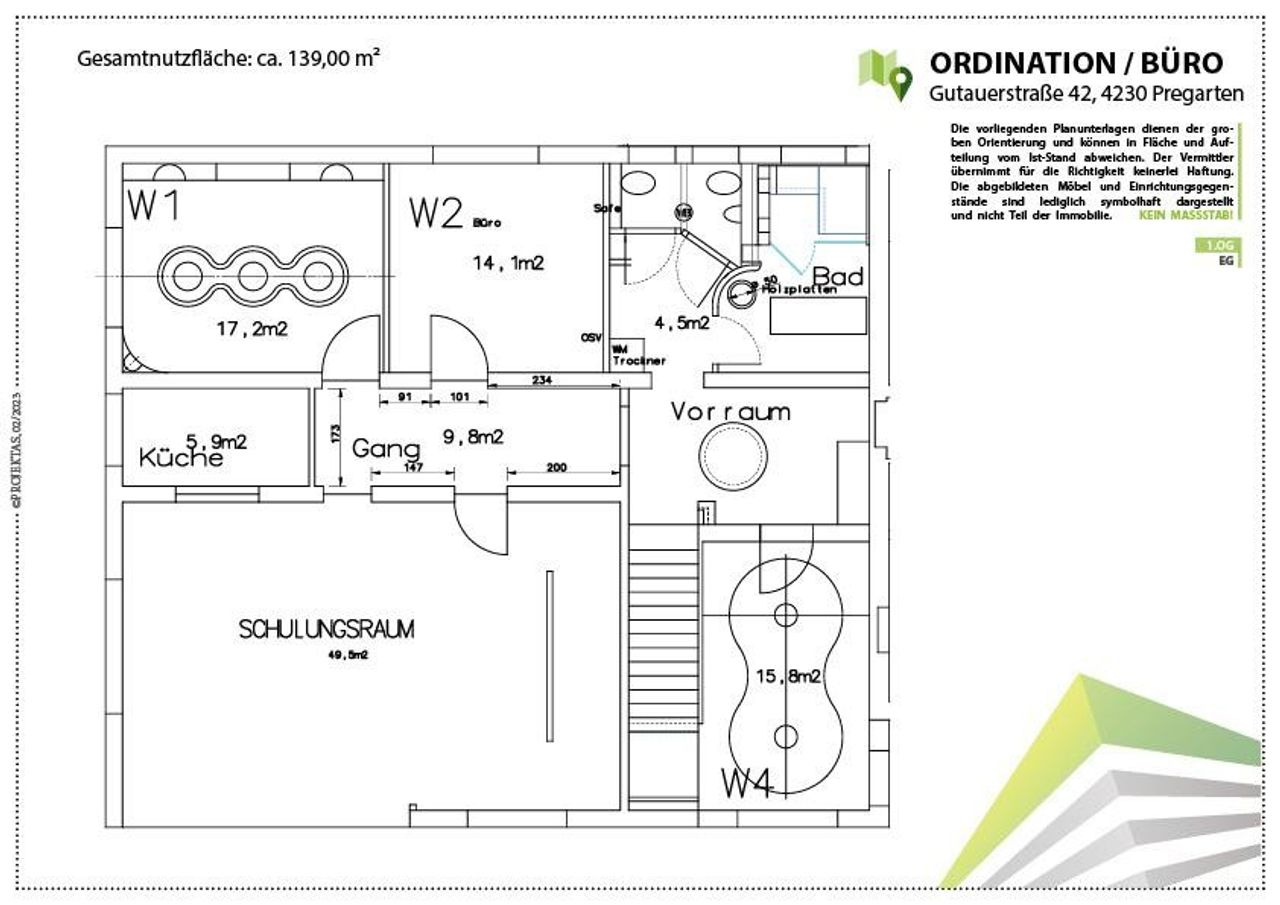 Diese sofort verfügbare Ordinations- oder Bürofläche ist unterteilt in eine ca. 135,56 m² ebenerdige Einheit und eine ca. 139 m² Einheit im 1. OG.