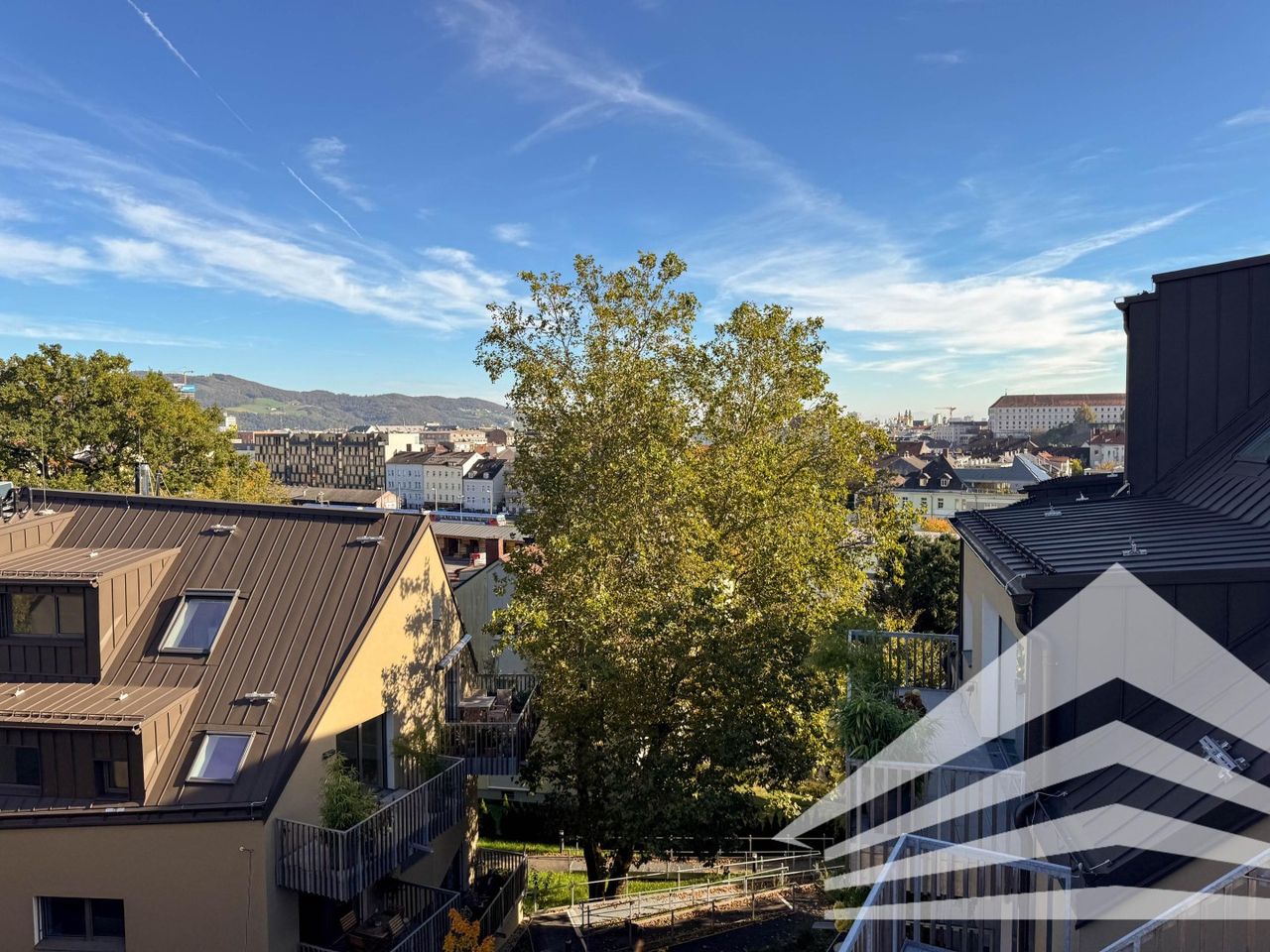 Die wunderschöne Platane ist das grüne Herz im Innenhof der Anlage und sorgt für gutes Klima und wohltuenden Schatten im Sommer. Vom Gartengeschoss bis zu den großzügigen Penthouse-Wohnungen ergeben sich immer wieder tolle Blicke, sowohl auf die Stadt und das Linzer Schloss als auch in den liebevoll angelegten Innenhof und das umliegende Hügelland samt dem Linzer Wahrzeichen "Pöstlingberg".