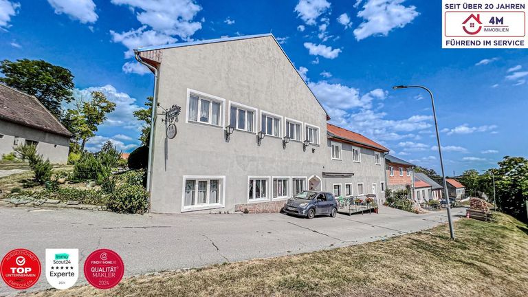 All in One - Wohnen und Gewerbe in Einem! Arbeiten quasi von zu Hause aus, auch die Vermietung der Gewerbeflächen ist eine lukrative Möglichkeit! Dieses einzigartige Objekt in Katzelsdorf (Gemeinde Bernhardsthal) nahe Großkrut und Mistelbach bietet Ihnen ein komplettes Paket! Auf einer gesamtfläche von ca. 400m², finden sich genügend Wohnraum für eine Großfamilie (7 Zimmer + Terasse und Garten), ein voll ausgestattetes Gasthaus (Saal für größere Feiern) und ein separates Gastrolokal für das Tagesgeschäft. Der idyllische Landschaftsteich verschafft einen Traumblick auf die umliegende Natur. Die Gewerbeobjekte sind voll ausgestattet und können sofort das Tagesgeschäft übernehmen. Das Haus wurde sukzessive saniert...