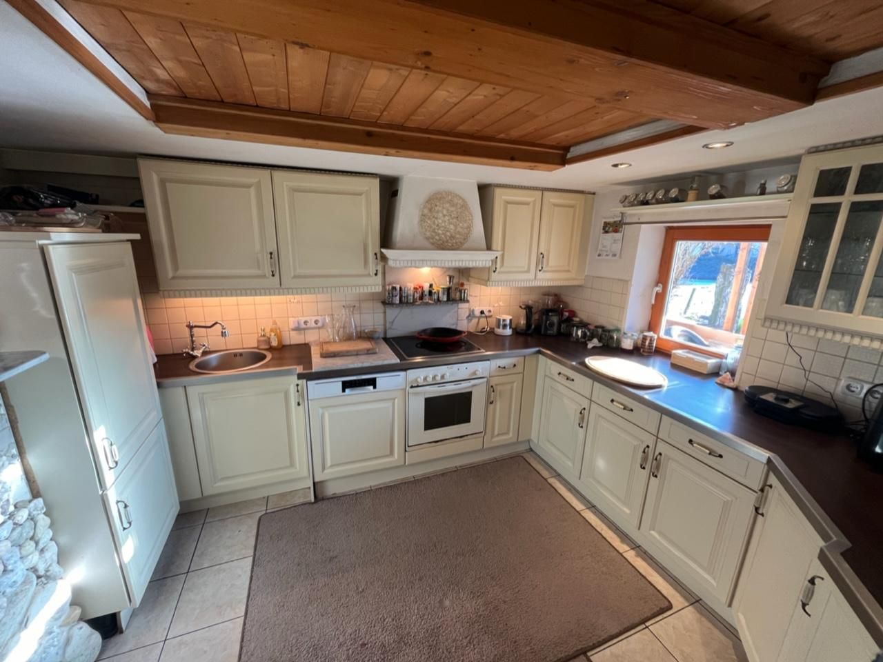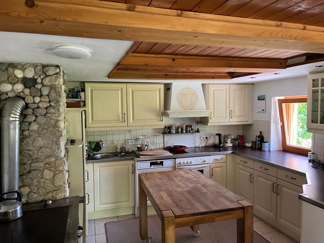EG: Wohnküche mit Holzofen, Wirtschaftsraum, Badezimmer, Abstellräume, 1 Schlafzimmer