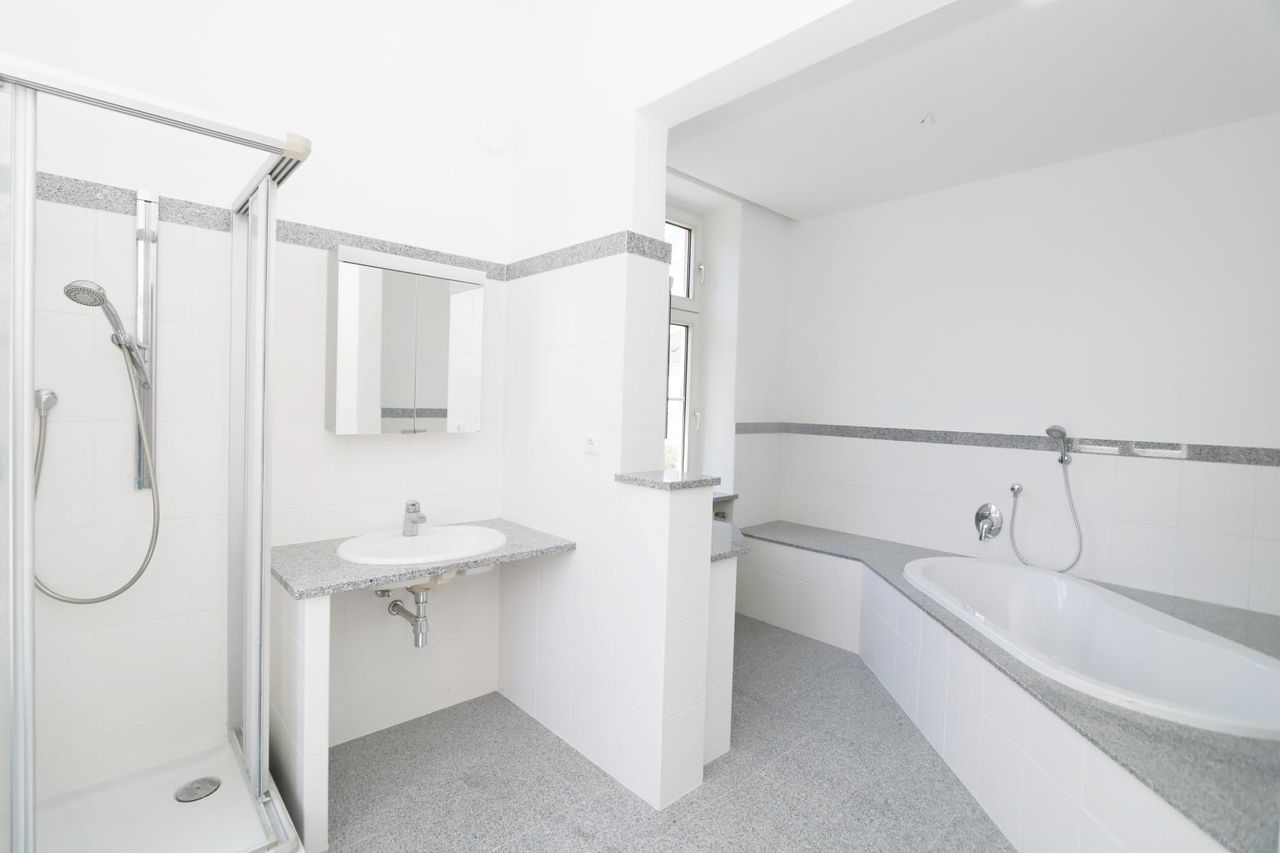 Es stehen Ihnen 6 Räume, zum Teil mit Flügeltüren , zwei Bäder (einmal mit Dusche und einmal mit Badewanne und Dusche, eine große Küche und ein separates WC zur Verfügung.
