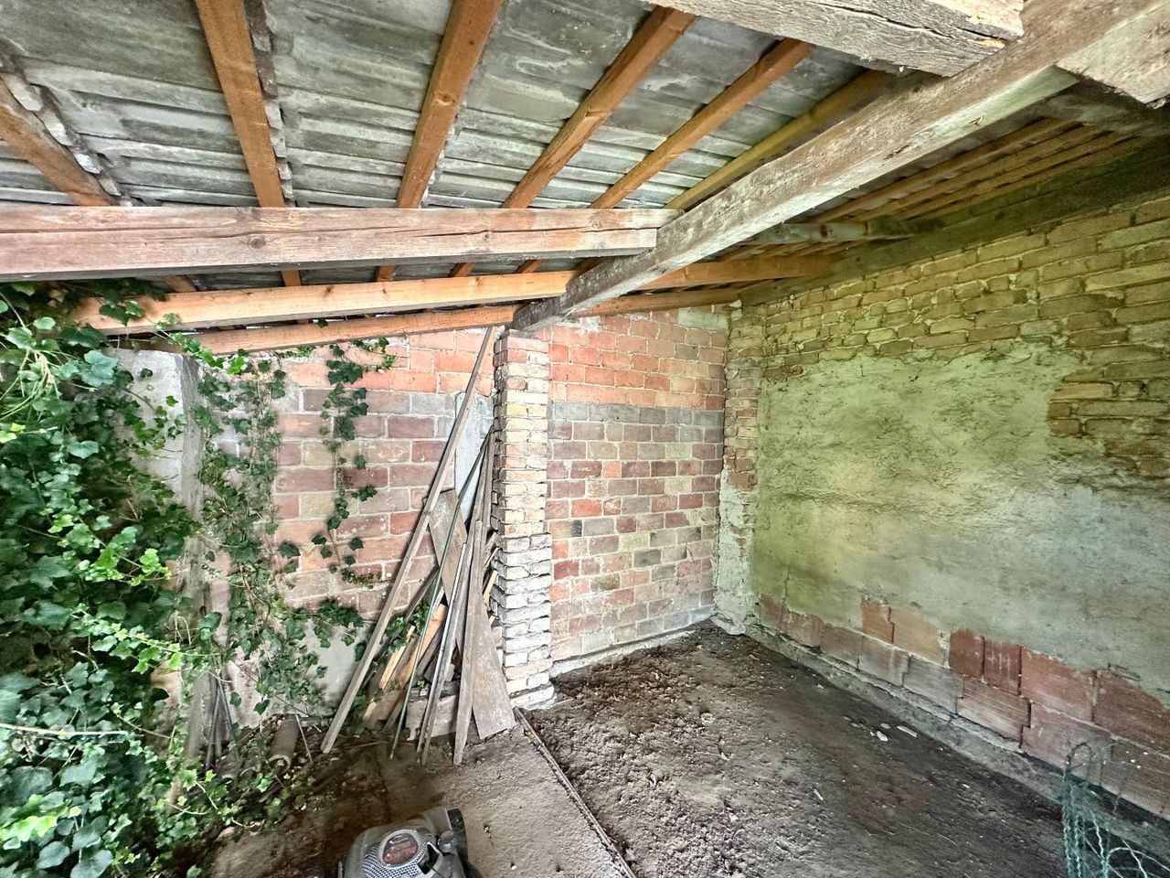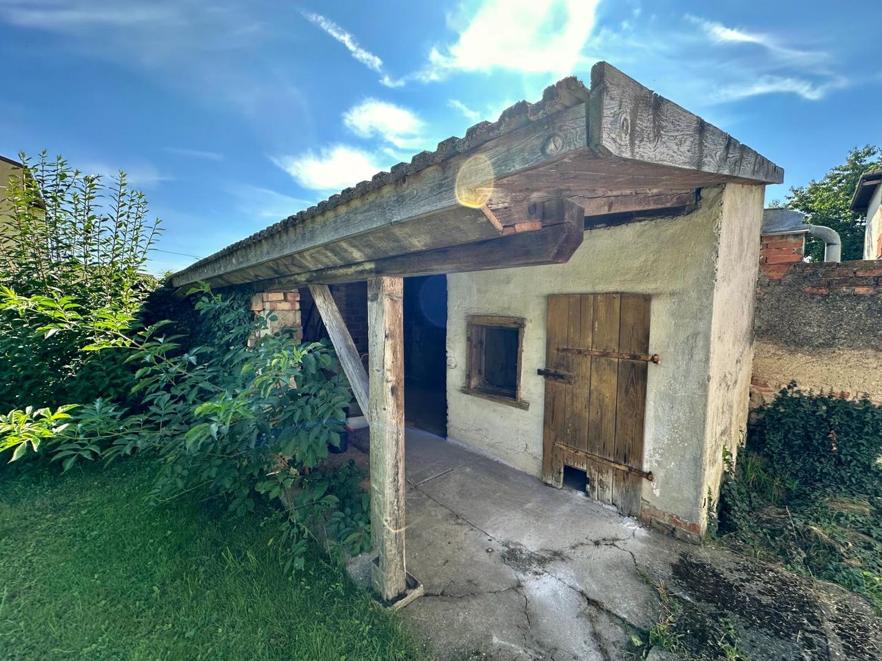 Im Garten befinden sich ein Unterstand, eine Einfahrt sowie ein Brunnen.