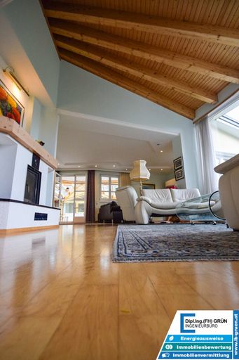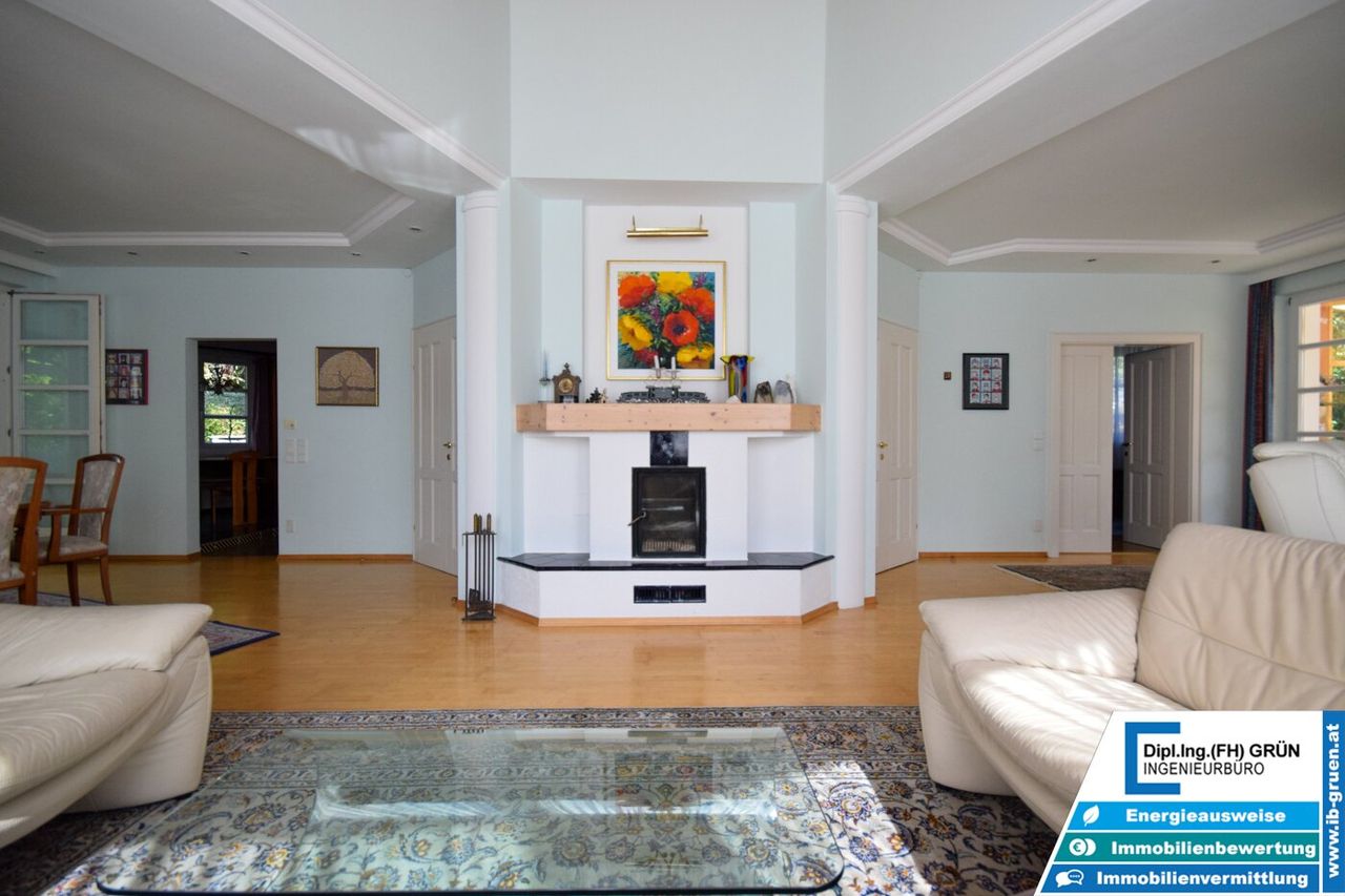Die Villa bietet rund 400 m² Wohnfläche (ca. 470 m² Nutzfläche) auf 3 Etagen und 939 m² Grund und überzeugt durch großzügige Räume, viel Licht und eine Planung, die Lebensqualität spürbar macht. Mittelpunkt ist der Wohnbereich mit beeindruckender Raumhöhe von bis zu 4,5 Metern und zentralem Kamin – ergänzt durch einen beheizbaren, verglasten Wintergarten mit direktem Zugang ins Grüne.