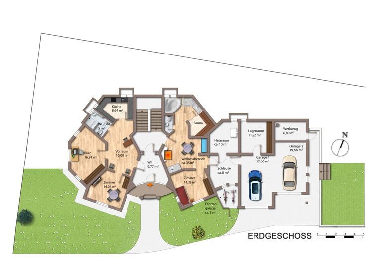 - Großer, privater Garten sowie Terrassen/Balkone und 2 Garagen