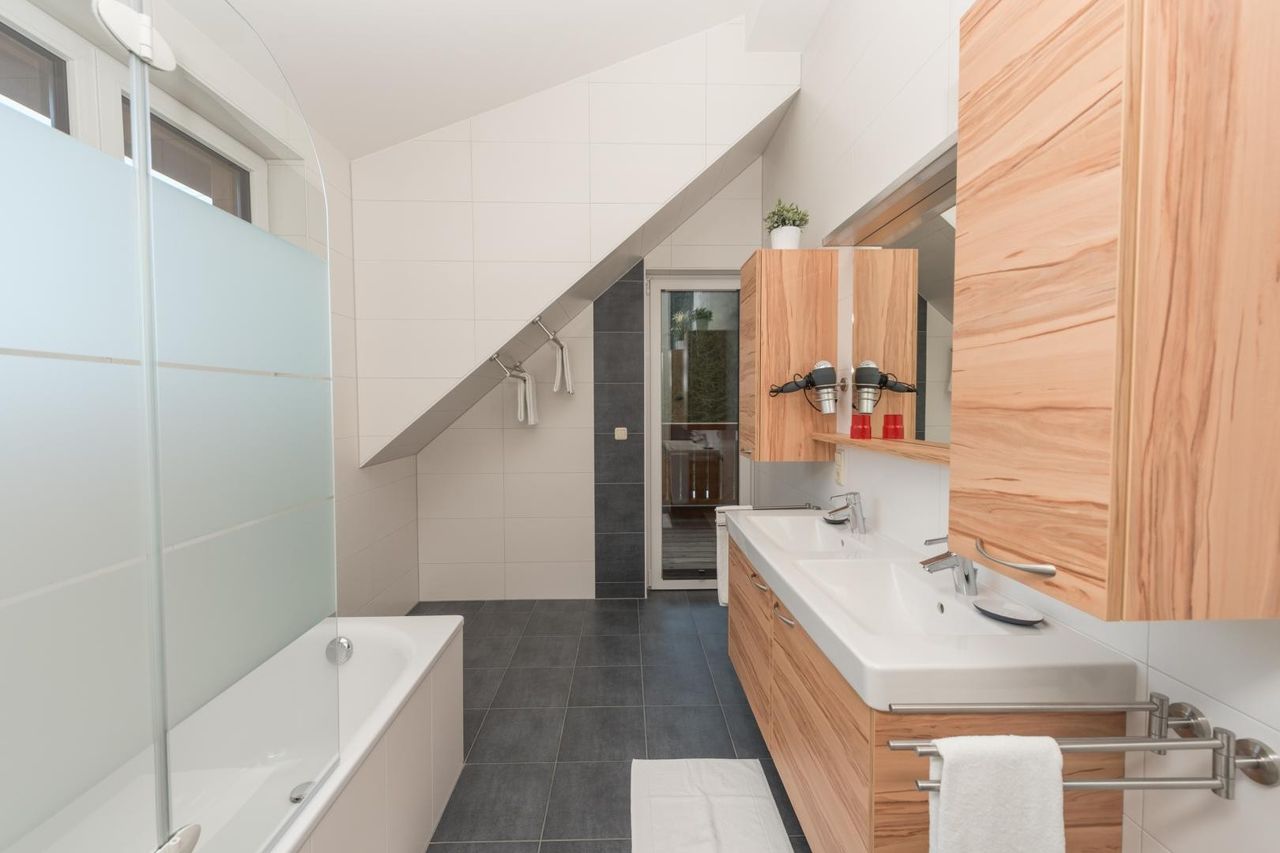 Bad mit Wanne, Doppelwaschbecken und Zugang zum Balkon, extra WC.