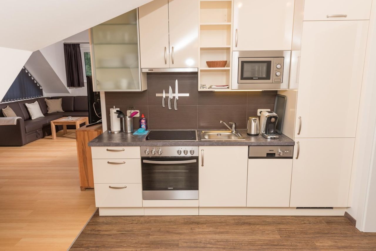 Küchenbereich mit Geschirrspüler, Ceranfeld, Backrohr, Mikrowelle, Dunstabzug, Kaffeemaschine, Kühl,- Gefrierschrank