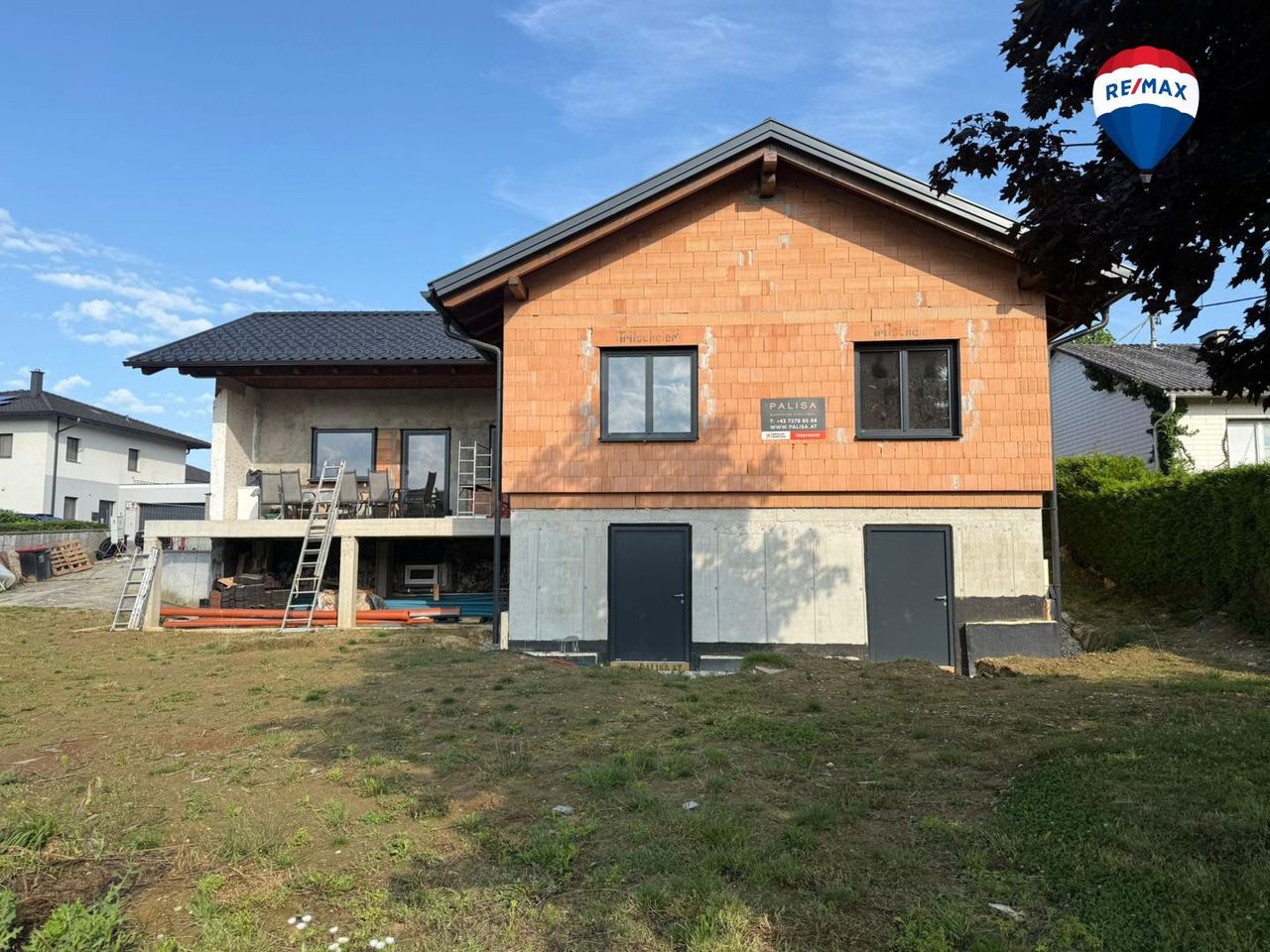 Dieser Einfamilienhaus-Rohbau wurde auf einem ebenen Baugrundstück in Ziegelbauweise errichtet. Er besteht aus einem ca. 60 m² großen Bestandsgebäude mit Kellergeschoss aus dem Jahr 1960 und dem 2024 angebauten Neubau samt Keller auch im Ausmaß von jeweils ca. 60 m². Der Rohbau ist inklusive Zwischenwände fertiggestellt. Die Außenwände des Bestandes wurden mit 30 er Ziegeln gemauert, die des Neubaues mit 50 cm Ziegel. Das mit Tondach-Ziegeln gedeckte Walmdach wurde bereits fertig gestellt.