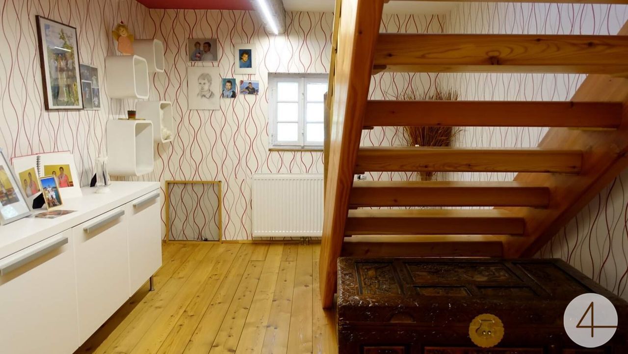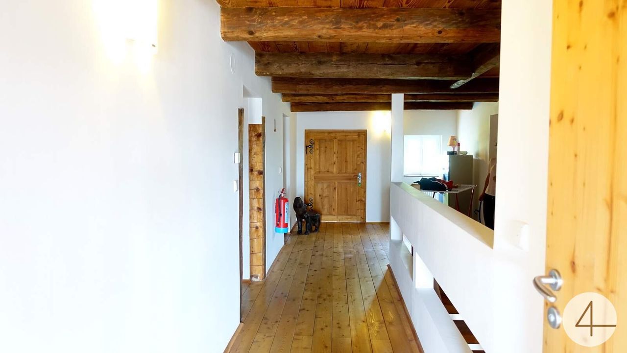 - Das Obergeschoss wird derzeit vom Eigentümer als Schlaf-Etage genützt. Raumaufteilung: drei Schlafzimmer, Bad, Wäscheraum, WC sowie zwei Vorräume und Aufgang in das galerieartig ausgebaute Dachgeschoss.