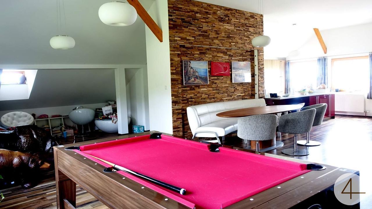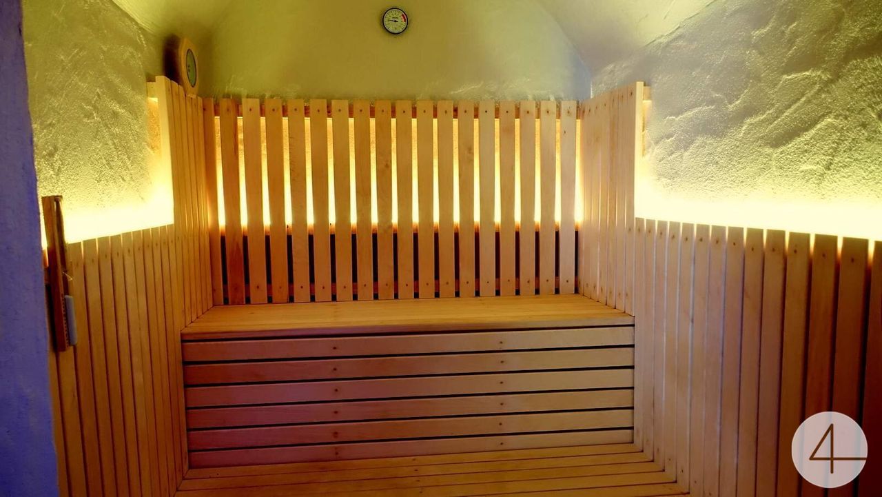 - Im Untergeschoss befindet sich ein Wellness-Bereich mit Sauna und Kellerräume, die mit einer Küche, Wohn-Essbereich, Bad mit Dusche und WC ausgestattet wurden.