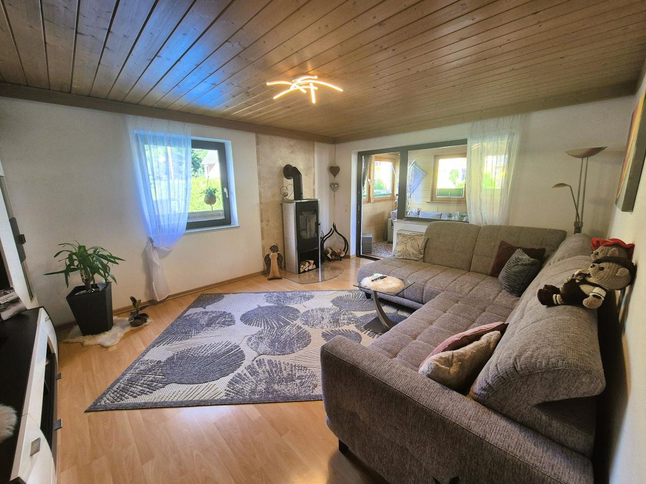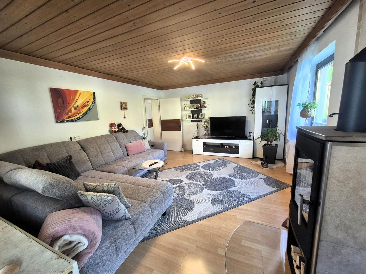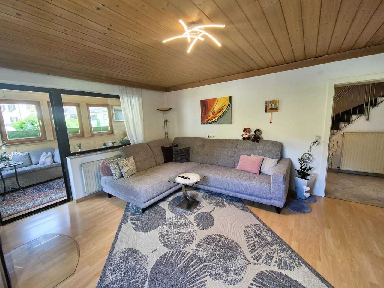 Im Erdgeschoss befindet sich ein geräumiger Vorraum, eine tolle Küche (2012), ein kleines Arbeitszimmer, ein WC und das Bad sowie das extra große Wohnzimmer mit Kamin und Zugang zum Wintergarten und Balkon.