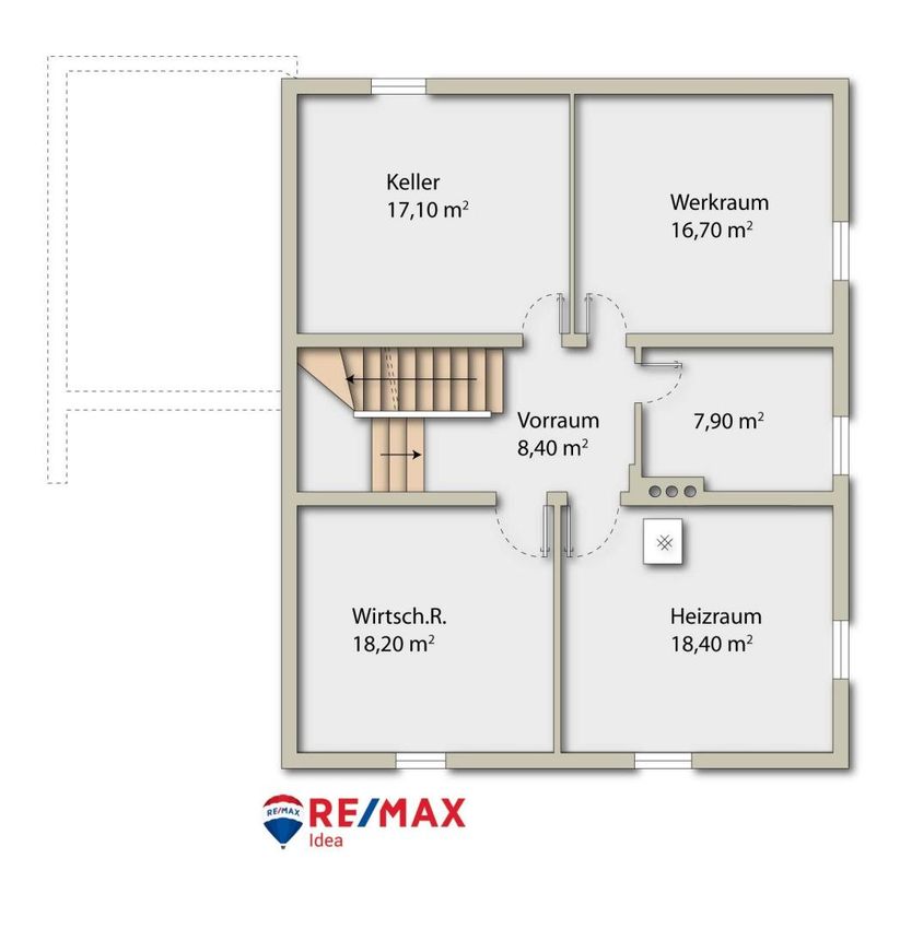 * KG: Vorraum, 2 Lagerräume, 1 alte "Selch" (Räucherkammer), 1 großer Lagerraum (Holz) mit Heiztechnik und Tankraum
