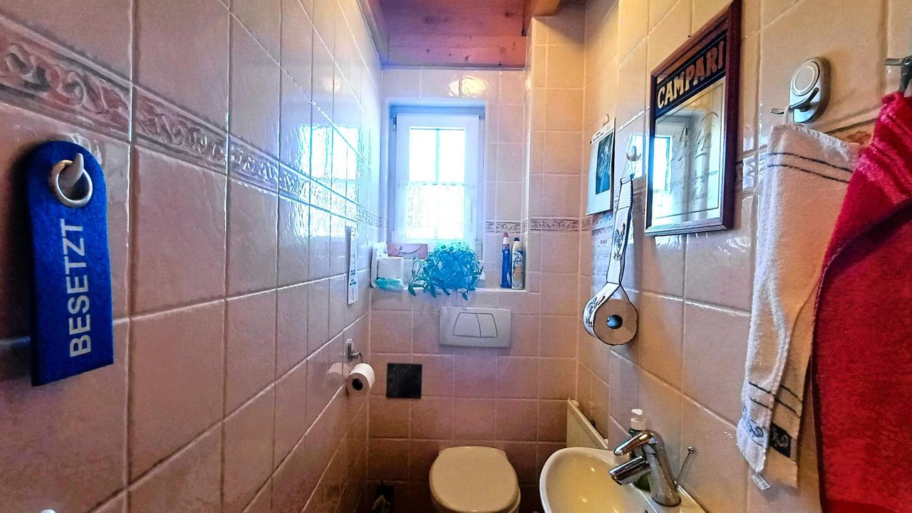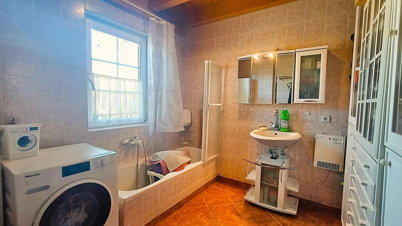 Ein Vorraum mit gefliester Stiege zum Dachgeschoss, ein großes Bad mit Badewanne, ein WC, ein Zimmer mit weiterem Zugang zum Garten und kleiner Terrasse vervollständigen den Grundriss.