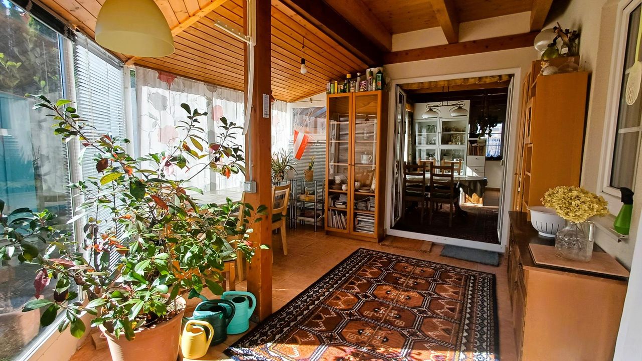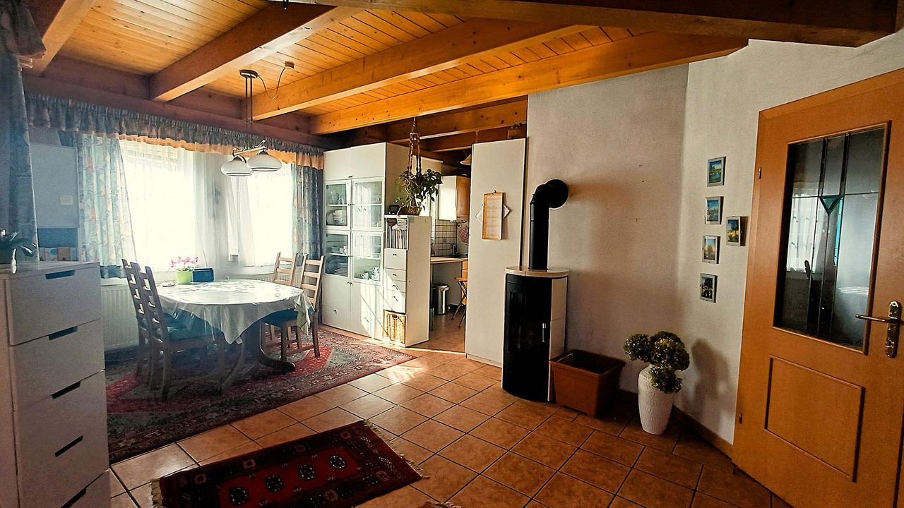 Highlight ist der offene Wohnbereich im Erdgeschoss bestehend aus Wohnzimmer, Küche, hellem Essbereich und Übergang zum großen Wintergarten mit Ausblick in den Garten. Die heimelige Atmosphäre wird von einem Schwedenofen abgerundet.