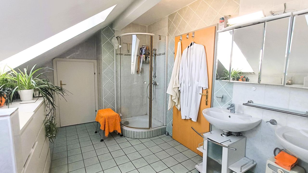 Im Dachgeschoß gibt es einen sehr großen Hauptraum mit großer Lagermöglichkeit, ein 25 m² großes Schlafzimmer, aus denen auch 2 Räume entstehen könnten, sowie ein sehr großes Bad mit WC.