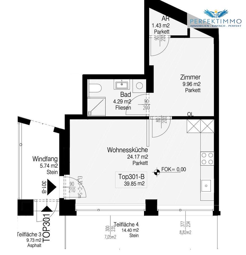 Top 301 B ist eine 2 Zimmer Wohnung mit 39,85 qm Wohnfläche. Die Wohnfläche verteilt sich auf eine großen Wohn/Essbereich, ein Schlafzimmern, ein Bad und einen Abstellraum. Darüber hinaus verfügt die Wohneinheit über einen Autoabstellplatz.