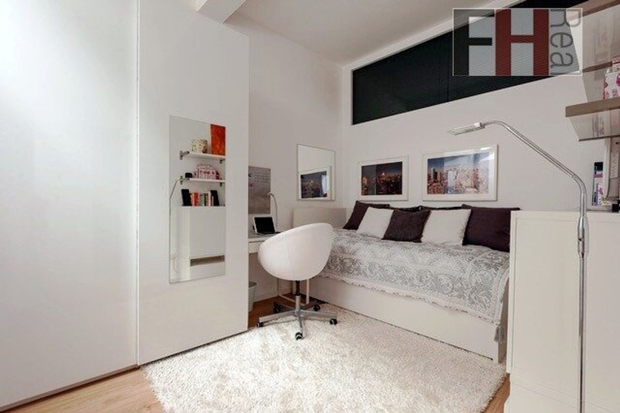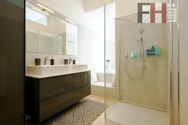 Ein sehr schöner, mit Fliesen belegter Stiegenaufgang führt in den zweiten Stock der Wohnung, wo sich ein weiteres, ca. 7m² großes, Badezimmer mit Dusche und Badewanne und einem großen Fenster mit Blick auf den Balkon befindet. Komplettiert wird diese Ebene mit zwei weiteren Zimmern, die derzeit als Arbeits-/ Wohnzimmer und Schlafzimmer gestaltet sind.