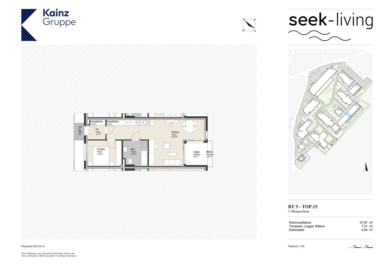 Die nach Süd Ost ausgerichtete 2 Zimmer Wohnung hat eine Wohnfläche von 57,97m² und lädt mit ihrer 7,31m² großen, herrlich ausladender Wohlfühlloggia zum gemeinsamen Entspannen ein. Lassen Sie sich von dem großen Wohn/Essbereich und lässig zurückversetztem Küchentraum mit viel Abstellfläche begeistern, der viel Platz für entspannte gemeinsame Stunden bietet. Die große Loggia mit Balkon mit einer Tiefe von 2,8m lädt zum gemütlichen Sonnenbaden mit kühlen Drinks ein. Schaffen Sie sich Ihre eigene SPA-Oase in dem großzügigen Badezimmer. Egal wie Sie Ihren neuen Lebensort gestalten, durchdachte Grundrisse und eine moderne Bauweise und ein geräumiges Kellerabteil sorgen für unbeschwertes Wohnen über Jahrzehnte.