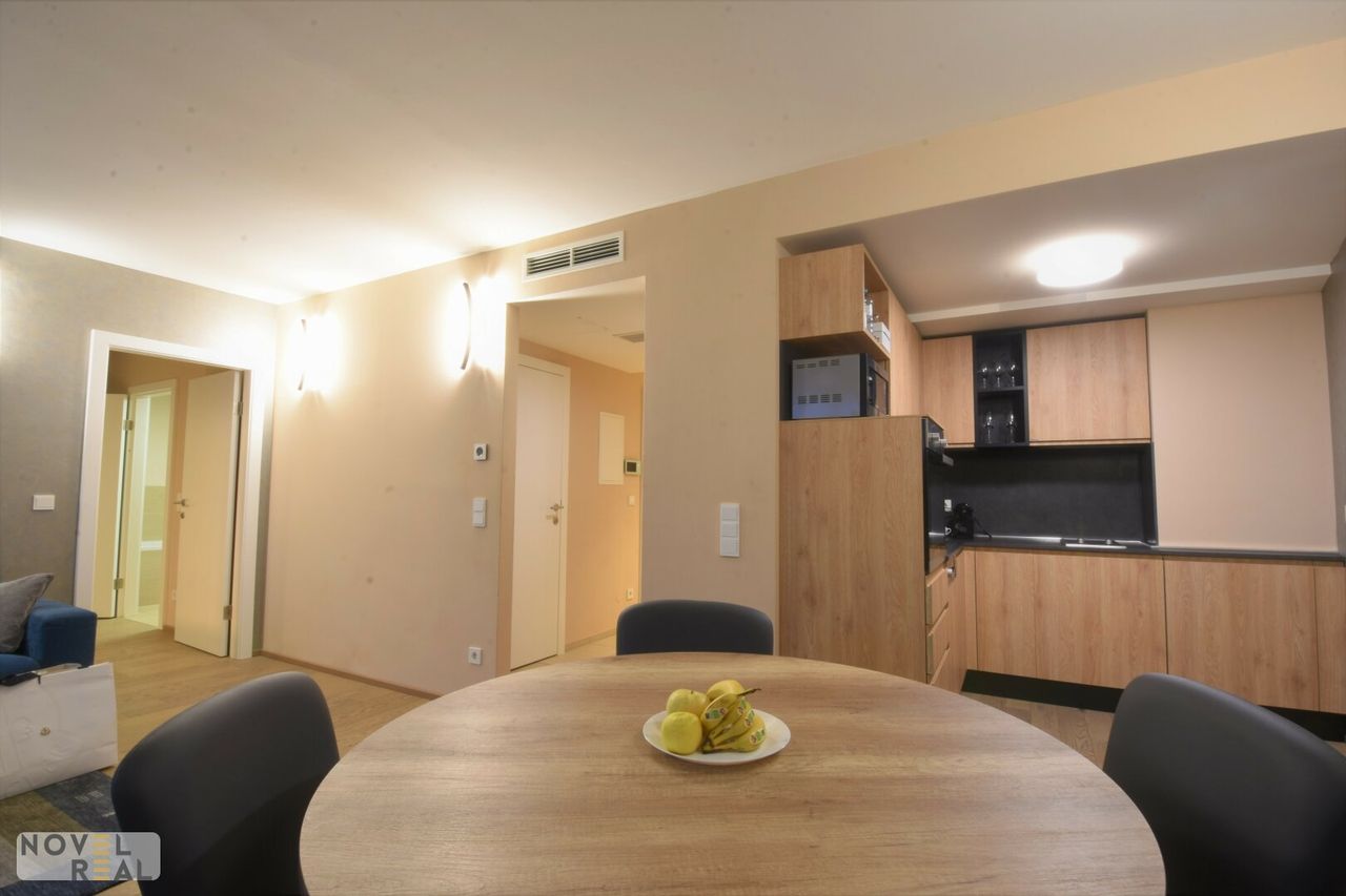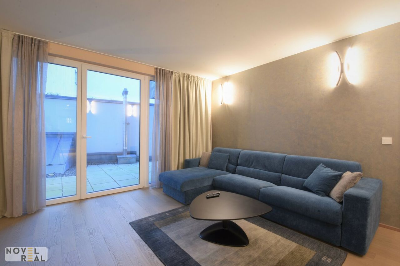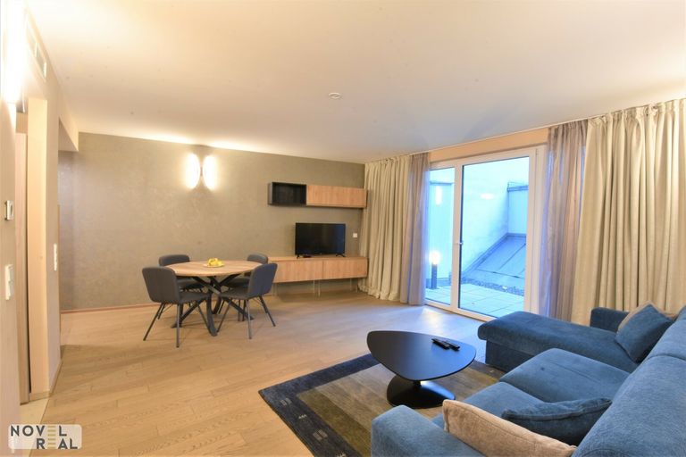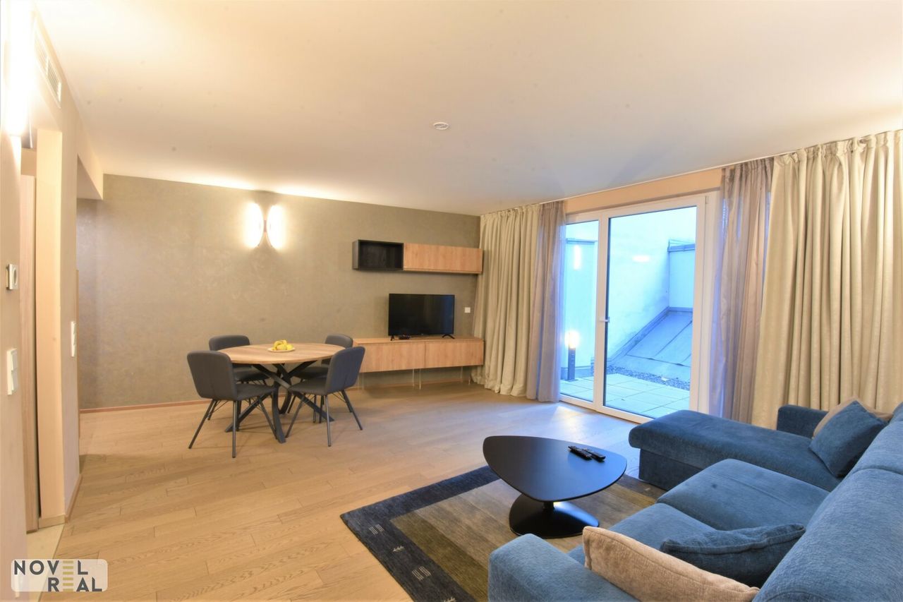 Zum Verkauf steht eine vollmöblierte, ca. 63 m2 große Luxuswohnung in Bestlage des 6. Bezirks. Die Wohnung befindet sich im 1. Obergeschoß eines modernen Neubaus nahe der Mariahilfer Straße und besteht aus einem großzügigen Wohn-/Küchenbereich mit exklusiver italienischer Designerausstattung sowie einem Schlafzimmer mit elegantem Badezimmer en suite. Eine große Innenhofterrasse mit über 33 m2 ist vom Wohnzimmer aus begehbar. Die Terrasse überschaut weitere Terrassen im Innenhof, was den Eindruck eines riesigen Gartens ergibt. Ein edler Parkettboden in den Wohnräumen schafft eine warme Atmosphäre. Fußbodenheizung und Klimatisierung erzeugen eine perfekte individuelle Raumtemperatur zum Wohlfühlen. Elektrische Außenjalousien regulieren die Lichtsituation nach Bedarf. Das Haus verfügt über eine Tiefgarage, in welcher sich Stellplätze monatliche anmieten lassen. Gäste können ihren PKW auch stundenweise dort abstellen. Jede Wohnung verfügt über ein Kellerabteil. Im Keller befinden sich weiters Kinderwagen- und (Elektro-)Fahrradabstellräume mit zusätzlich Aufhängevorrichtungen und Ablagen sowie 8 E-Bike Ladestationen, eine Waschküche und ein Kinderspielraum.