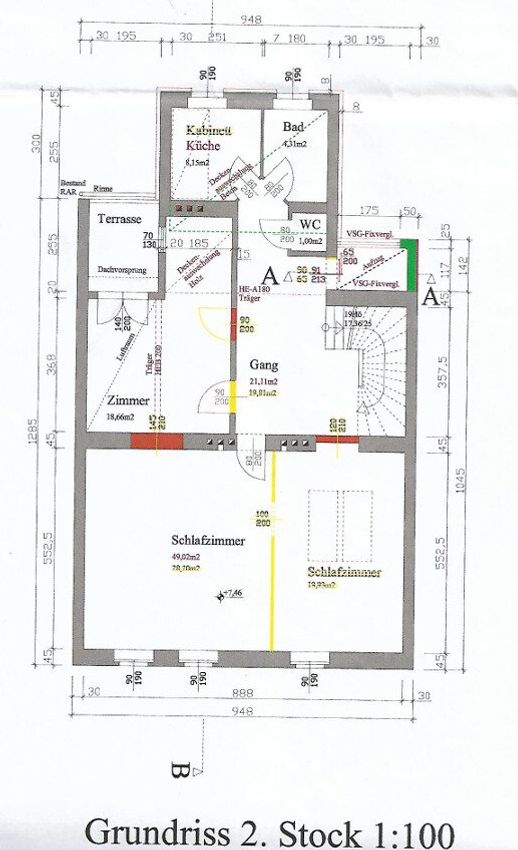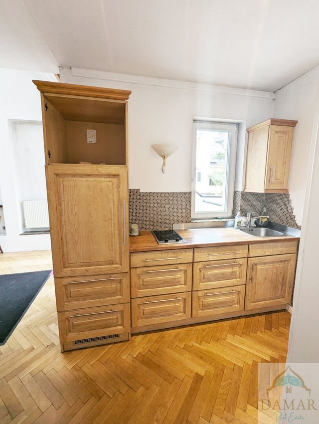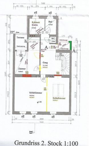 - 2.Stock: 3 Zimmer, moderne Einbauküche, Bad, WC und Terrasse, Nutzfläche ca. 106 m2 mit einer Raumhöhe von 3,10 m.