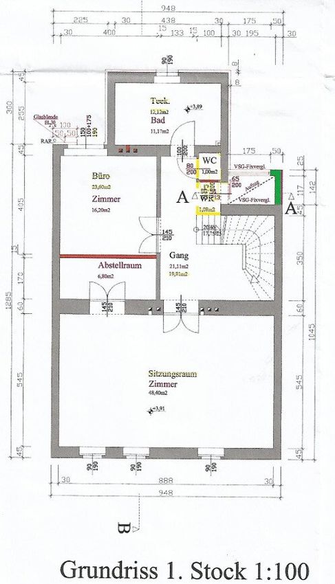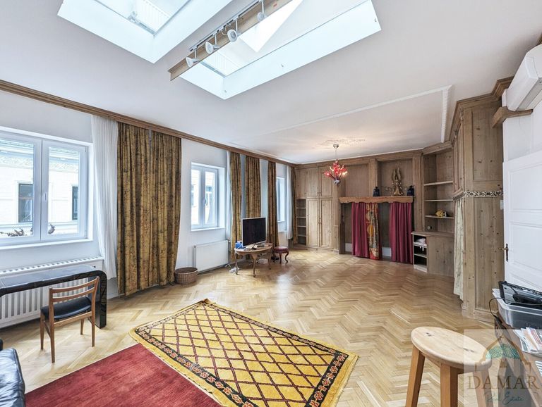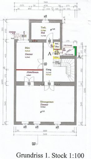 - 1.Stock: Wohnzimmer mit ca. 50 m2, Teeküche, Bad, WC, Büro oder Bibliothek und ein Abstellraum, Nutzfläche ca. 106 m2 mit einer Raumhöhe von 3,55 m.