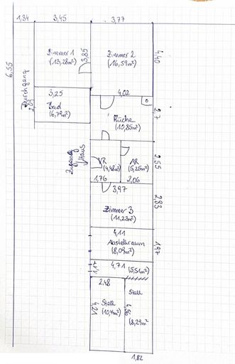 - Erdgeschoss: Vorzimmer, Abstellraum, Küche, 3 Zimmer, Badezimmer