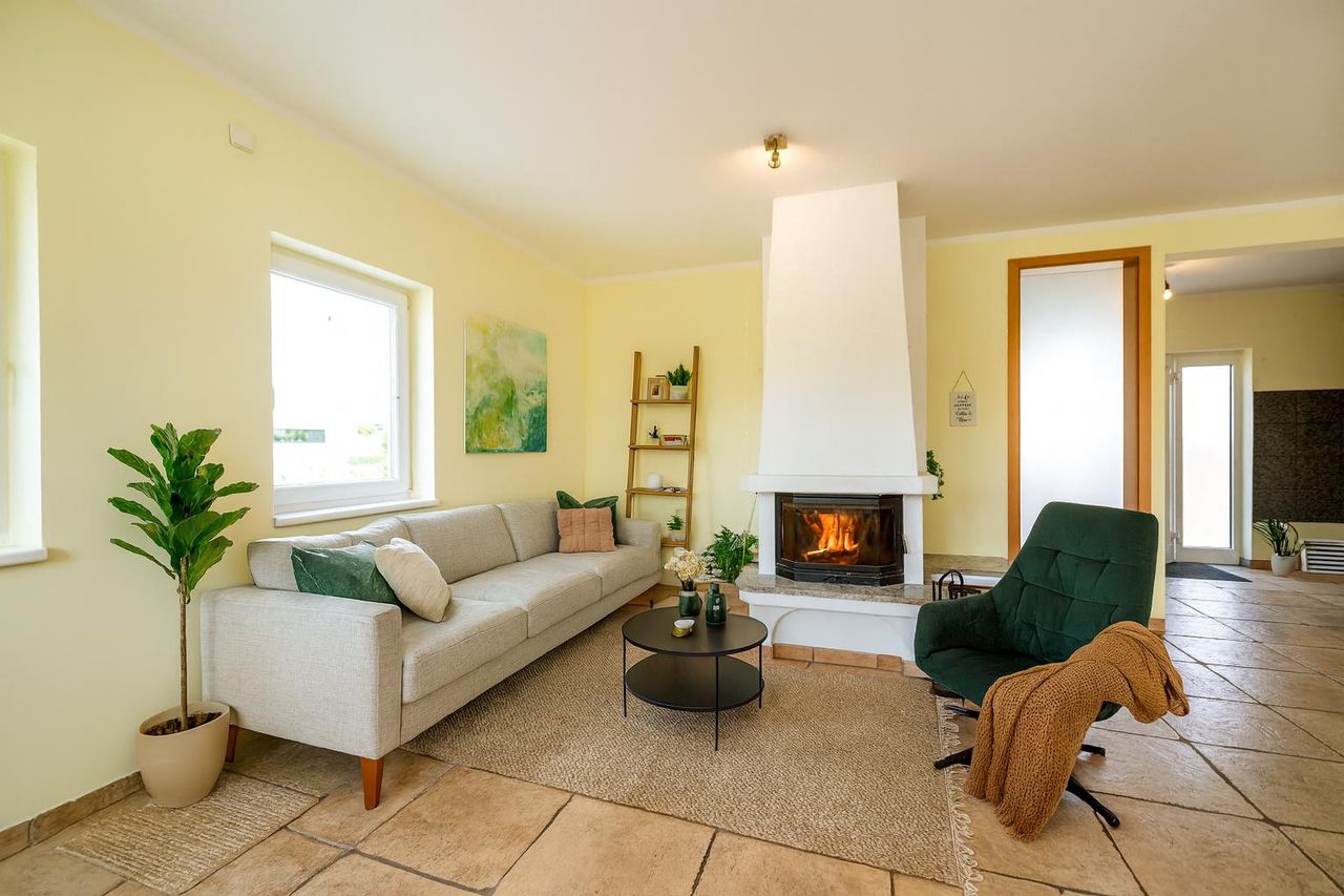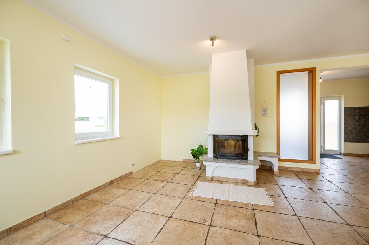 Für ein gemütliches, warme Atmosphäre sorgt auch der offene Kamin.