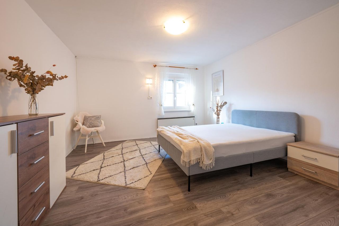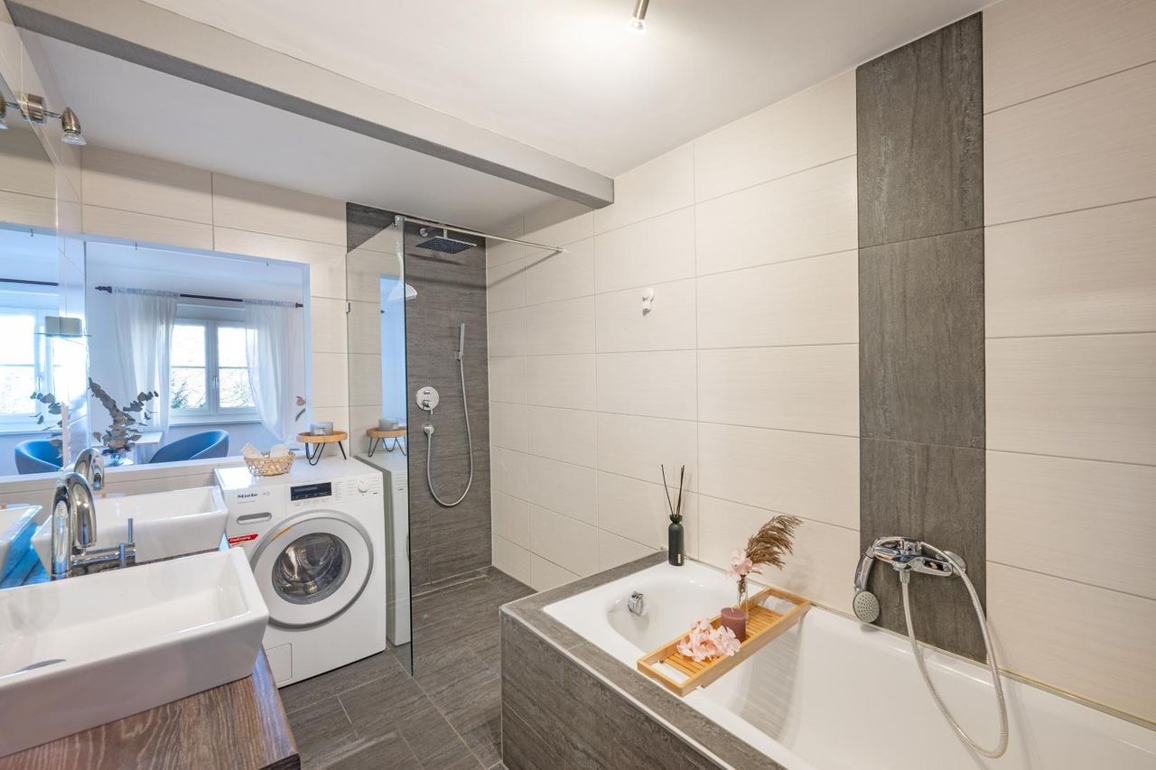 Über ein paar Stufen erreichen Sie den weiteren Wohnbereich mit zwei großzügigen Schlafzimmern samt Fernsehanschluss, einem modernen Badezimmer mit Badewanne, Dusche, Doppelwaschbecken und Waschmaschinenanschluss, einem separaten WC und einem kleinen Abstellraum. Die Gestaltung der Wohnräume bietet dabei ausreichend Platz für individuelle Einrichtungsideen und ein harmonisches Miteinander.