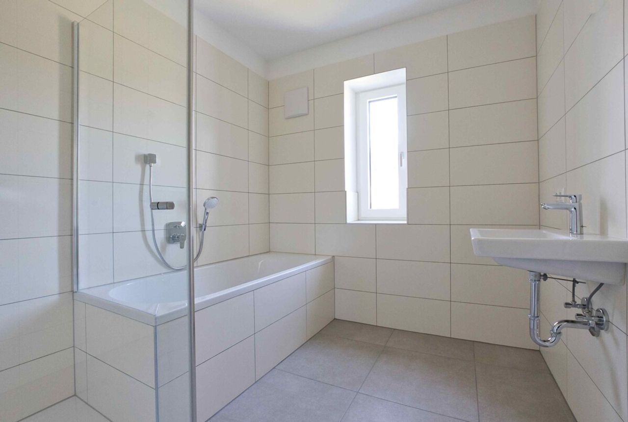 Das Badezimmer ist mit Badewanne und Dusche ausgestattet, zusätzlich stehen Ihnen ein separates WC sowie ein praktischer Abstellraum zur Verfügung.