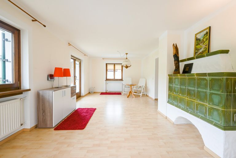 Die gut durchdachte Raumaufteilung sorgt für eine harmonische Atmosphäre. Die hochwertige Einbauküche ist nicht nur funktional, sondern auch ein echtes Highlight für jeden Hobbykoch. Der angrenzende Essbereich bietet Platz für gesellige Abendessen mit Familie und Freunden. Genießen Sie die zeitlosen Fliesen und den warmen Laminatboden, der für zusätzlichen Komfort sorgt. Im Ess- Wohnbereich sorgt ein gemütlicher Kachelofen für behagliche Wärme an kalten Wintertagen.