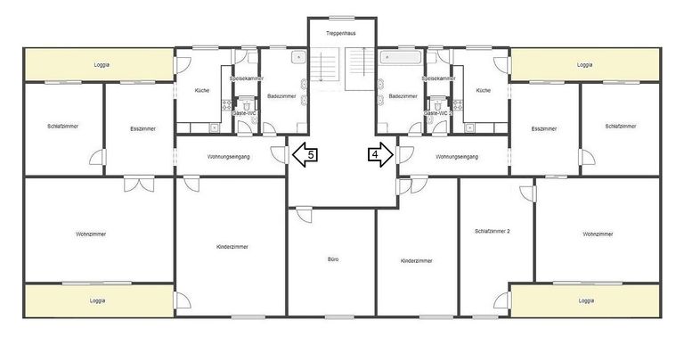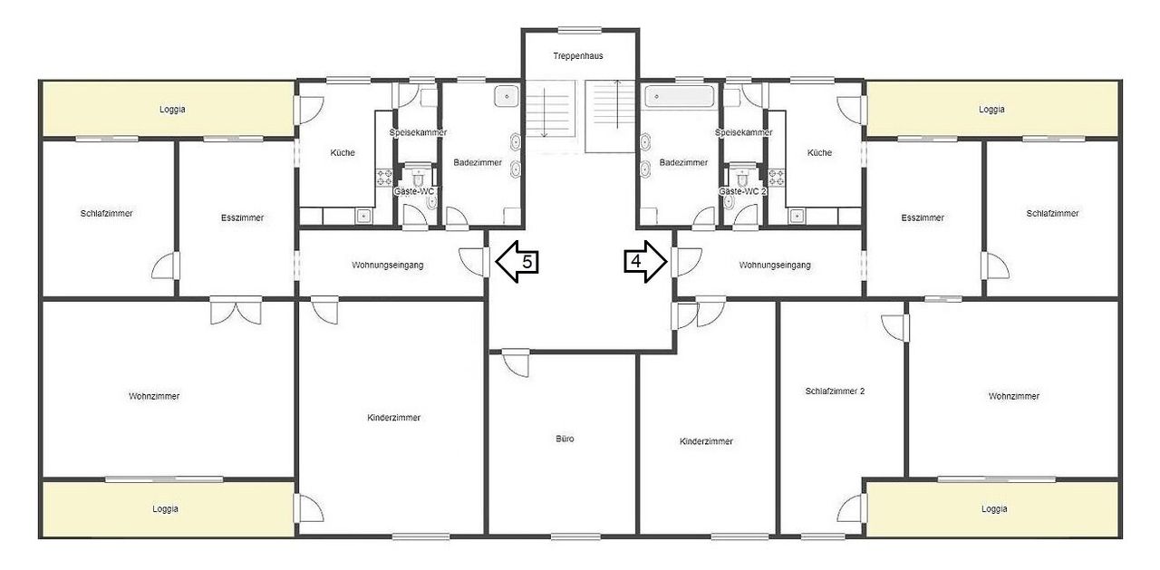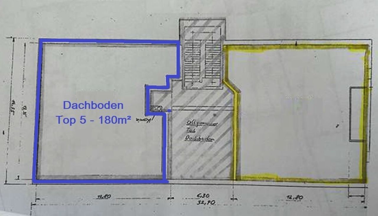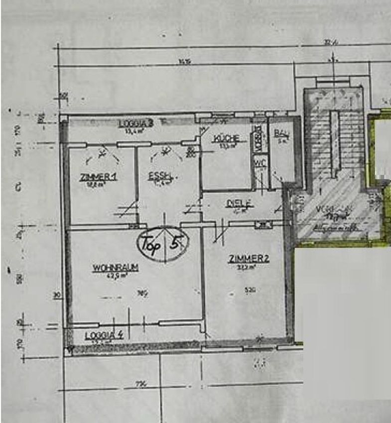 Im 1. und 2. Stock erstreckt sich die Top 5, diese besteht aus einer Wohnung im ersten Stock, mit ca.150m² und einem hohen Rohdachboden mit 180m², welcher auch noch ausgebaut werden könnte, außerdem gehört noch ein 510m² großer Garten an der Hinterseite des Gebäudes dazu und 2 Loggien mit ca. 27m². Die Wohnung besteht aus einem Vorraum, einem WC, einem großen Bad mit Doppelwaschbecken und Dusche, einem großen Wohnsalon, einem Esszimmer, 2 sehr geräumige Schlafzimmer mit Zugang zu jeweils einer Loggia und einer Küche, von der aus ein Abstellraum und auch die vordere Loggia erreichbar ist.