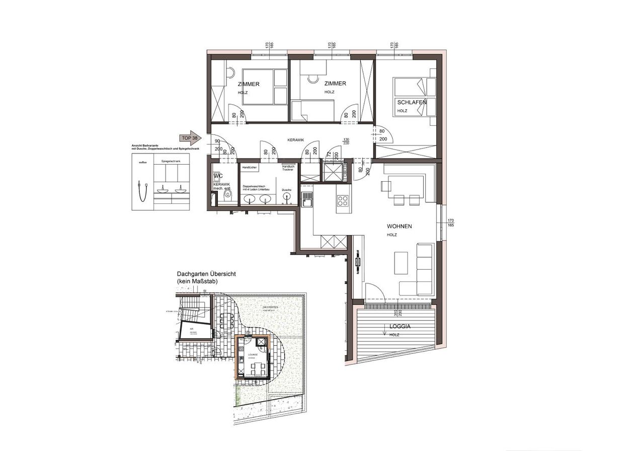 Die 4-Zimmer-Wohnung Top B38 kann auch in eine 3-Zimmer-Wohnung mit begehbaren Schrankraum transformiert werden. Das Wohnzimmer kann vergrößert werden. Für das Bad steht eine Variante mit Badewanne und eine Variante mit begehbarer Dusche zur Verfügung. Gerne gehen wir auf Ihre Wünsche individuell ein.