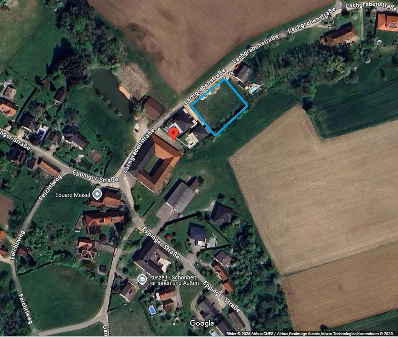 Ein fast ganz ebenes Grundstück mit Dorfgebietswidmung, also Bauland in EPPING , Buchkirchen. Daneben steht eine neugebaute Villa
