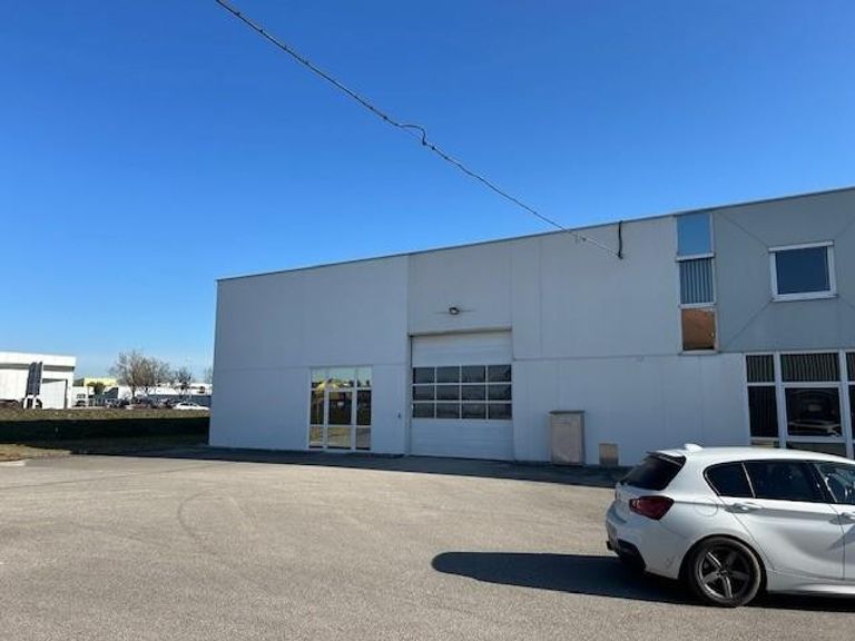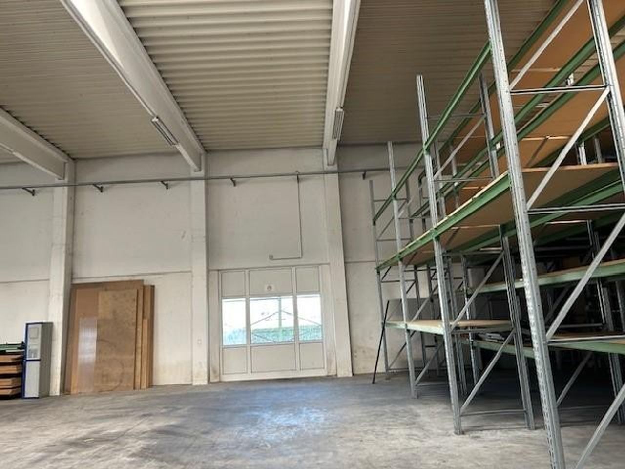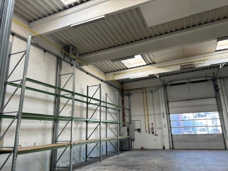 Es gibt eine 500 m2 Halle mit 7,50 Meter Höhe mit einem kleinen Obergeschoß und direktem Zugang zum Bürotrakt.