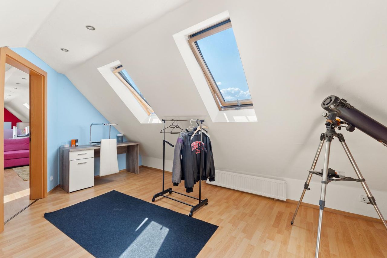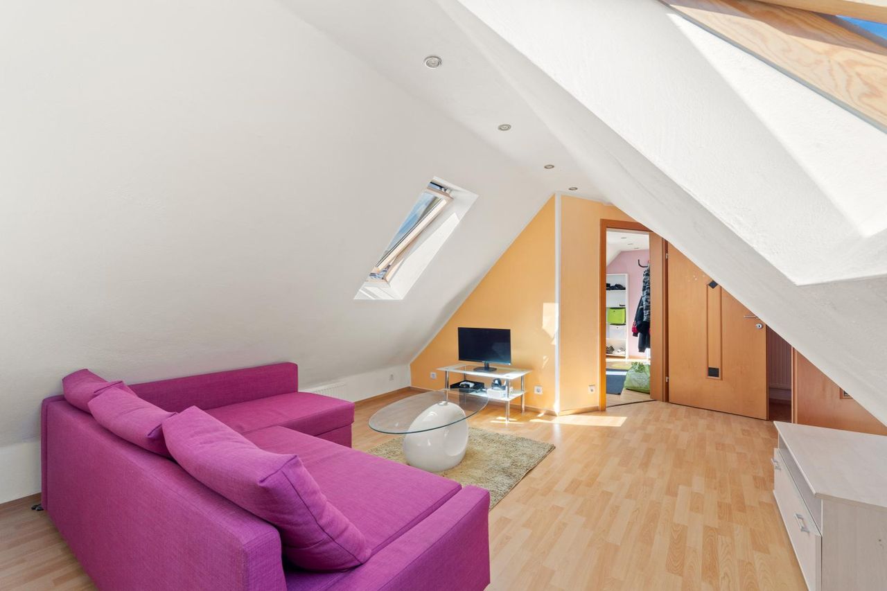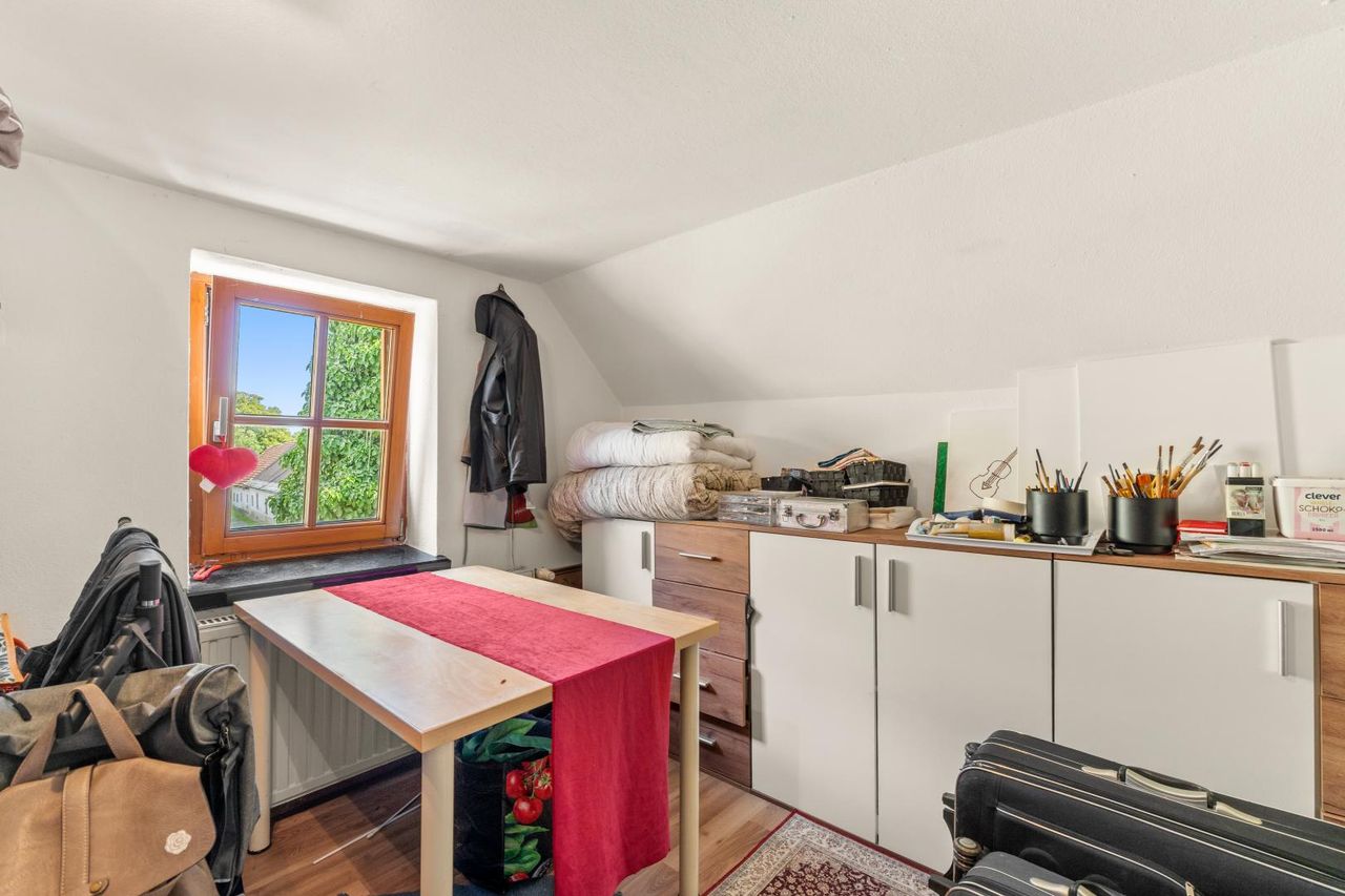 Im vorderen Bereich steht das ursprüngliche Bestandsgebäude, das fließend in den länglichen ehemaligen Wirtschaftstrakt übergeht – ein Grundriss, der Charme und Funktion vereint. Über das Dachgeschoss erreichen Sie einen überdachten südöstlich ausgerichteten Balkon mit ca. 14,5 m², welcher sich perfekt für ein sonniges Frühstück oder laue Abendstunden eignet.