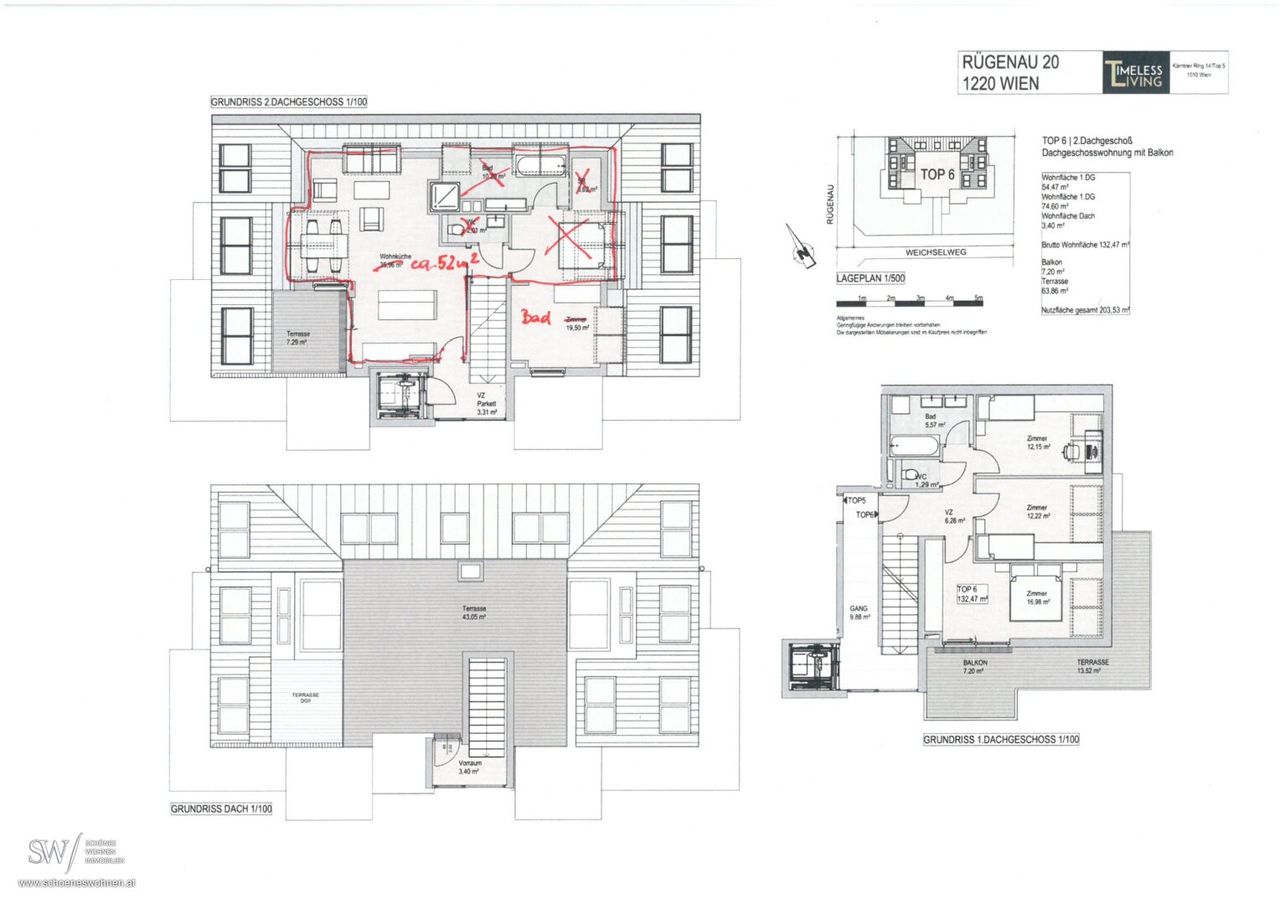 Ein offener Wohn- und Essbereich mit rund 52 m², fließend verbunden mit einer weiteren Terrasse und der großen Dachterrasse. (Planänderung siehe "Rügenau_Top6_Skizze)