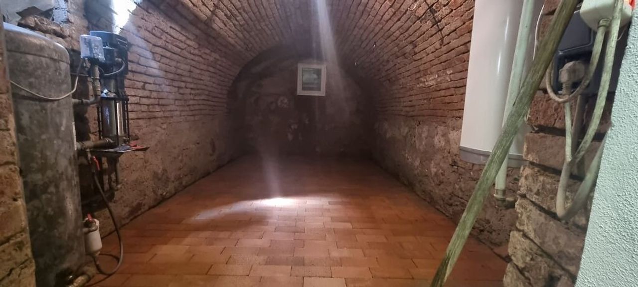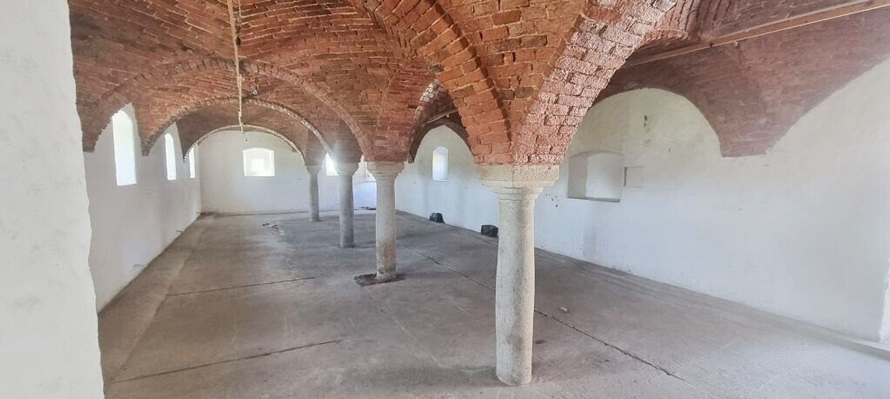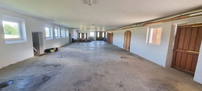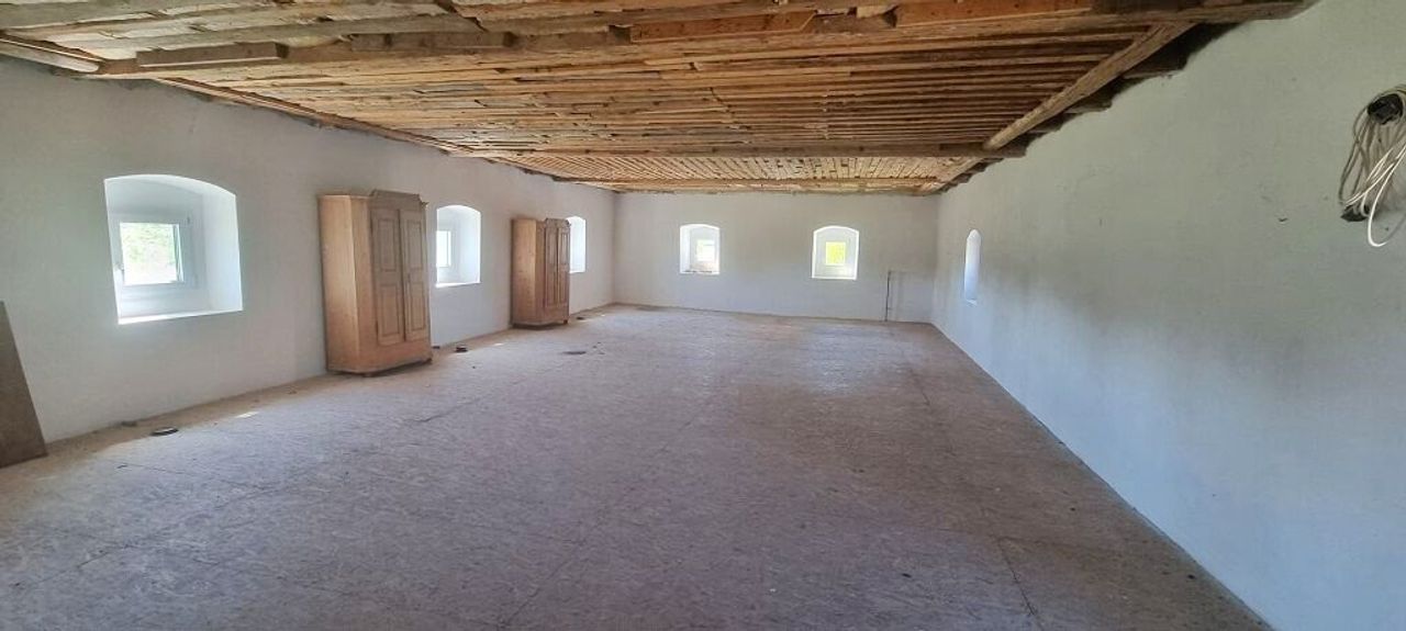Das ca. 280 m² große ehemalige Stallgebäude (EG und OG), besticht durch seine top sanierte Gewölbedecke auf Granitsäulen. Heizung, Wasser und Strom wurden auch hier neu installiert und vorbereitet.