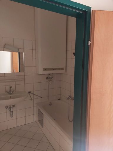 Offener Schlaf/Wohnbereich mit eingerichteter Küche. Bad mit Badewanne und Waschbecken.