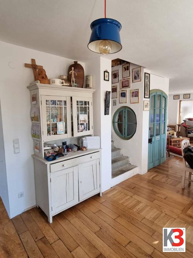 - Offener Koch-/Ess-/Wohnbereich - In diesem großzügigen, lichtdurchfluteten Raum mit Kamin Anschluss liegt ein antiker Parkettboden aus der Administrativen Bibliothek des Bundeskanzleramtes. Dieser Raum bietet direkten Zugang auf die Sonnenterrasse.
