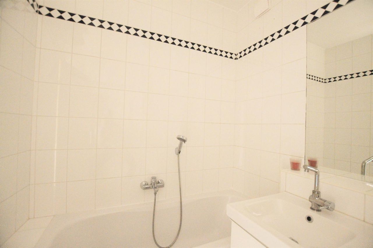 Das Badezimmer ist mit Badewanne, Dusche, Waschtisch und Handtuchtrockner ausgestattet, das WC ist getrennt.
