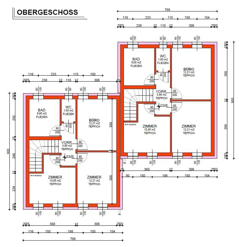Das Erdgeschoss ist offen gestaltet - offener Küchen-, Ess- und Wohnbereich. Der Technikraum befindet sich im Erdgeschoss beim Eingangsbereich. Vier weitere Zimmer befinden sich im Obergeschoss, wo sich auch das Badezimmer mit Fenster und ein extra WC (auch mit Fenster), befinden.