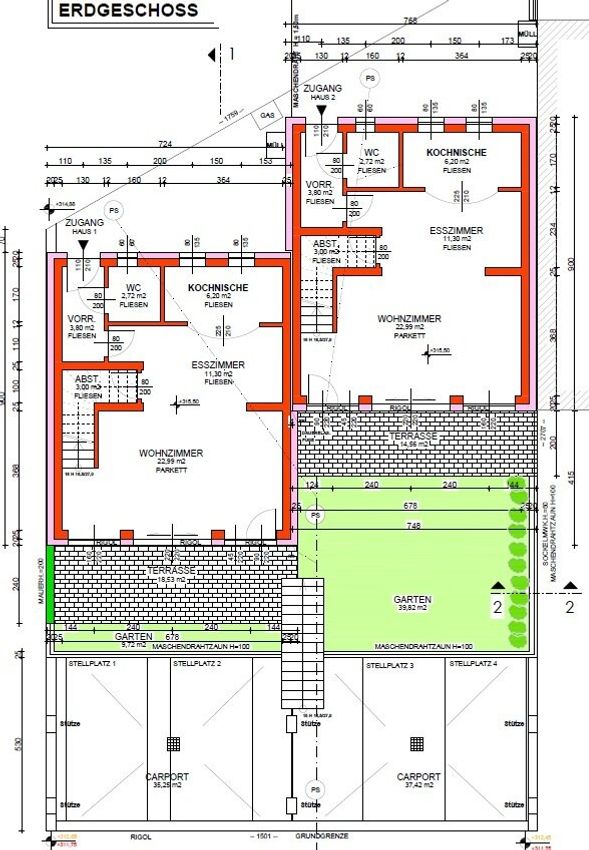Zum jeweiligen Haus gehören zwei betonierte Carports. Genau so gibt es KFZ-Abstellplätze beim Hauseingang.