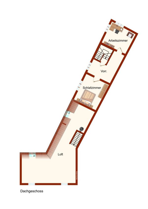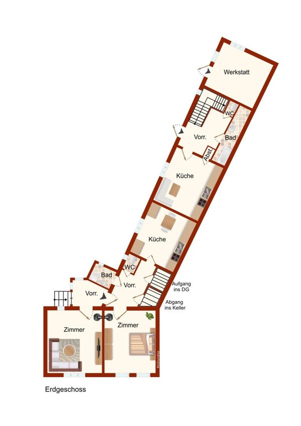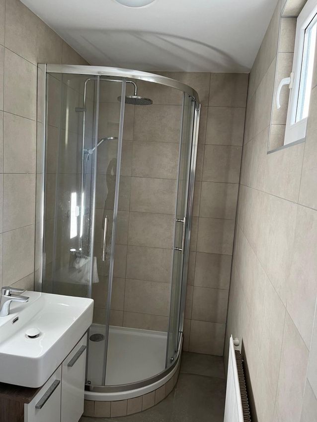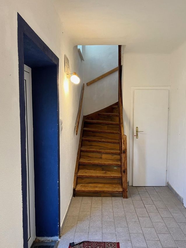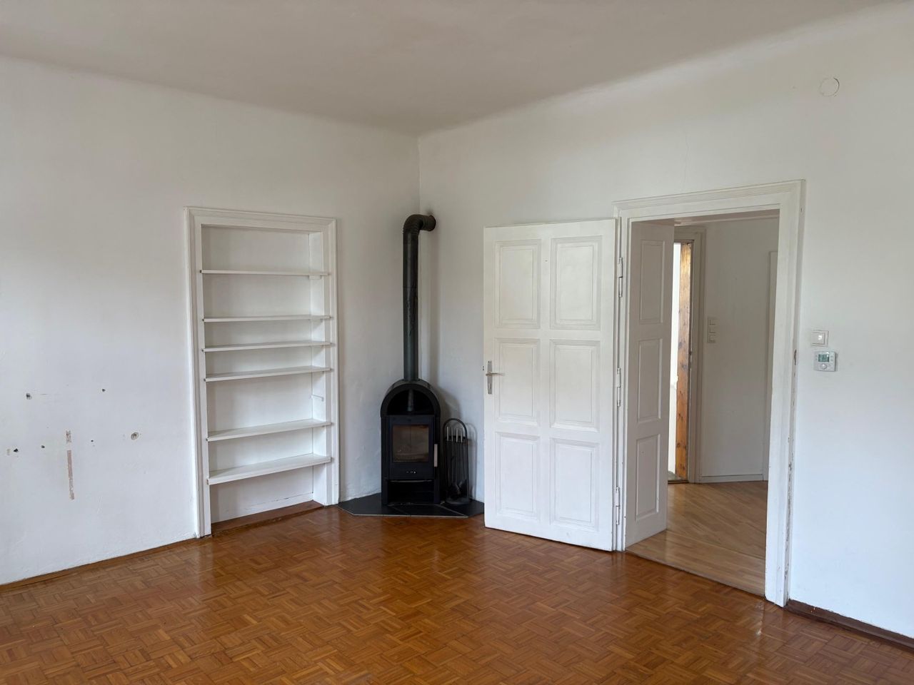 Die Aufteilung: mit einigen Stufen gelangen Sie ins Erdgeschoss mit dem sehr geräumigen Vorzimmer, Küche mit Essplatz, Bad mit Dusche, extra WC und 2 Zimmer. In jedem Zimmer befindet sich ein Holzofen. Das Gebäude hat aber auch eine Gastherme mit Heizkörper. Der Dachboden ist mit einer Holztreppe erschlossen. Wir befinden uns hier schon in der Dachschräge, aber der offene sogenannte LOFT - artige Raum bietet viele Möglichkeiten. Auch hier befindet sich ein Holzofen. Das Haus ist teilweise unterkellert. Die Gasthermen für beide Häuser befinden sich diesem Keller. Elektrisch und heiztechnisch sind beide Objekte getrennt. Verbunden sind sie nur mit einer Wand.