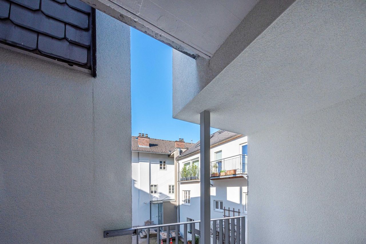 Ein weiterer Balkon liegt hofseitig und kann sowohl vom Schlaf- als auch Badezimmer betreten werden.