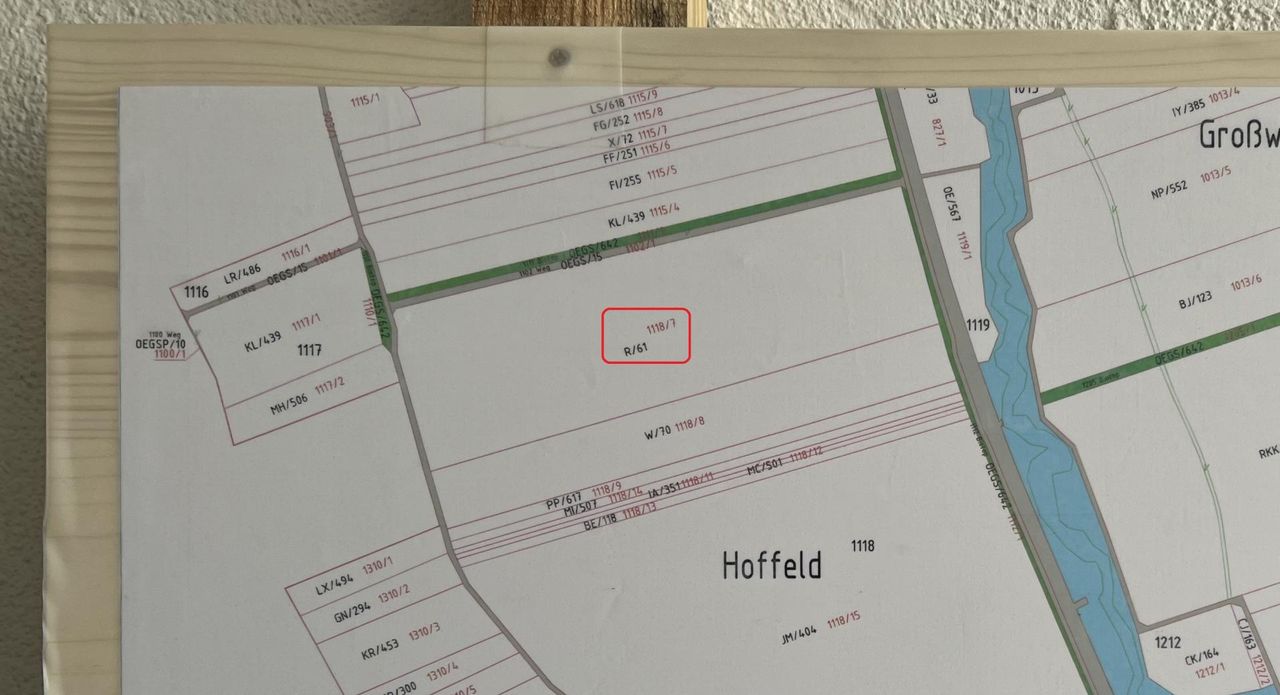 Das Grundstück befindet sich im Status ländlicher Neuordnung. Zuteilungsausweis, Übersichtsplan und Grundstücksvermarkungen (Messpunkte) sind bereits vorhanden.