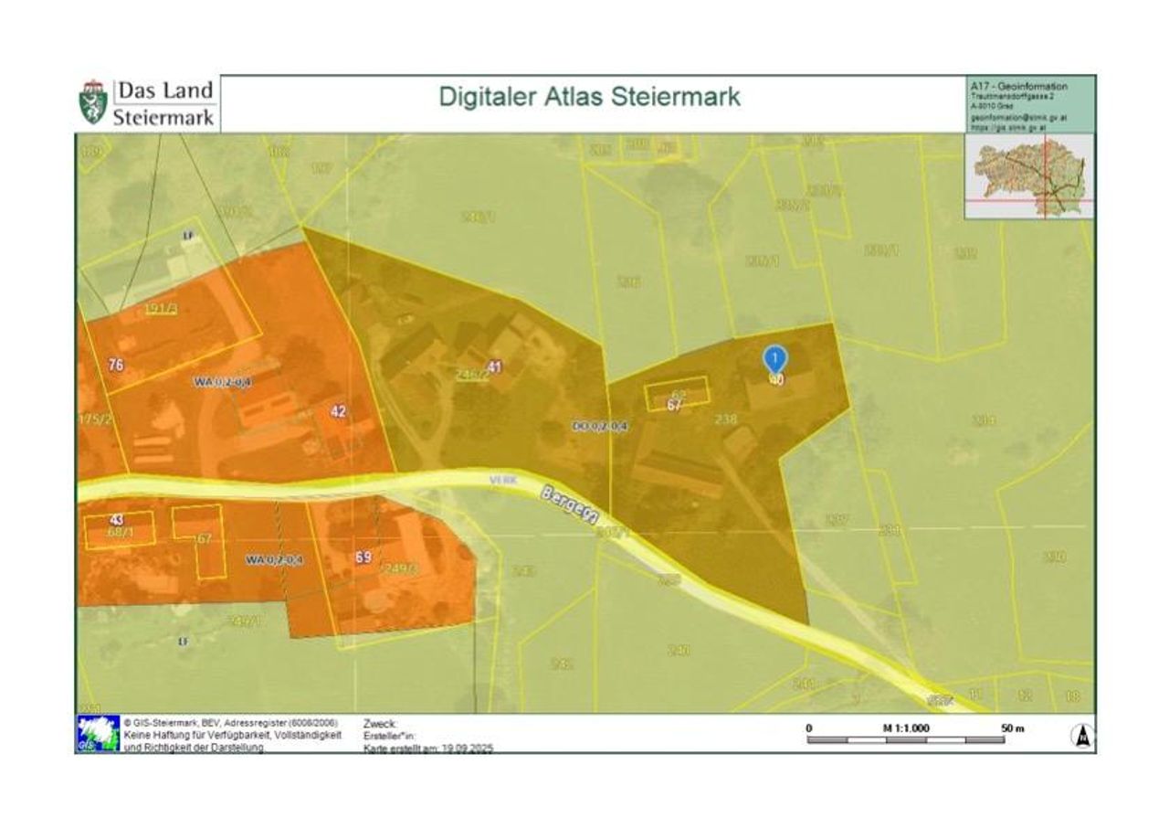 Die Bezirkshauptstadt Deutschlandsberg erreichen Sie in ca. 10 Fahrminuten. In die Landeshauptstadt Graz fahren Sie ca. eine halbe Stunde mit dem Auto. Weitere Informationen zur Infrastruktur entnehmen Sie bitte beiliegendem Lage-Exposé.