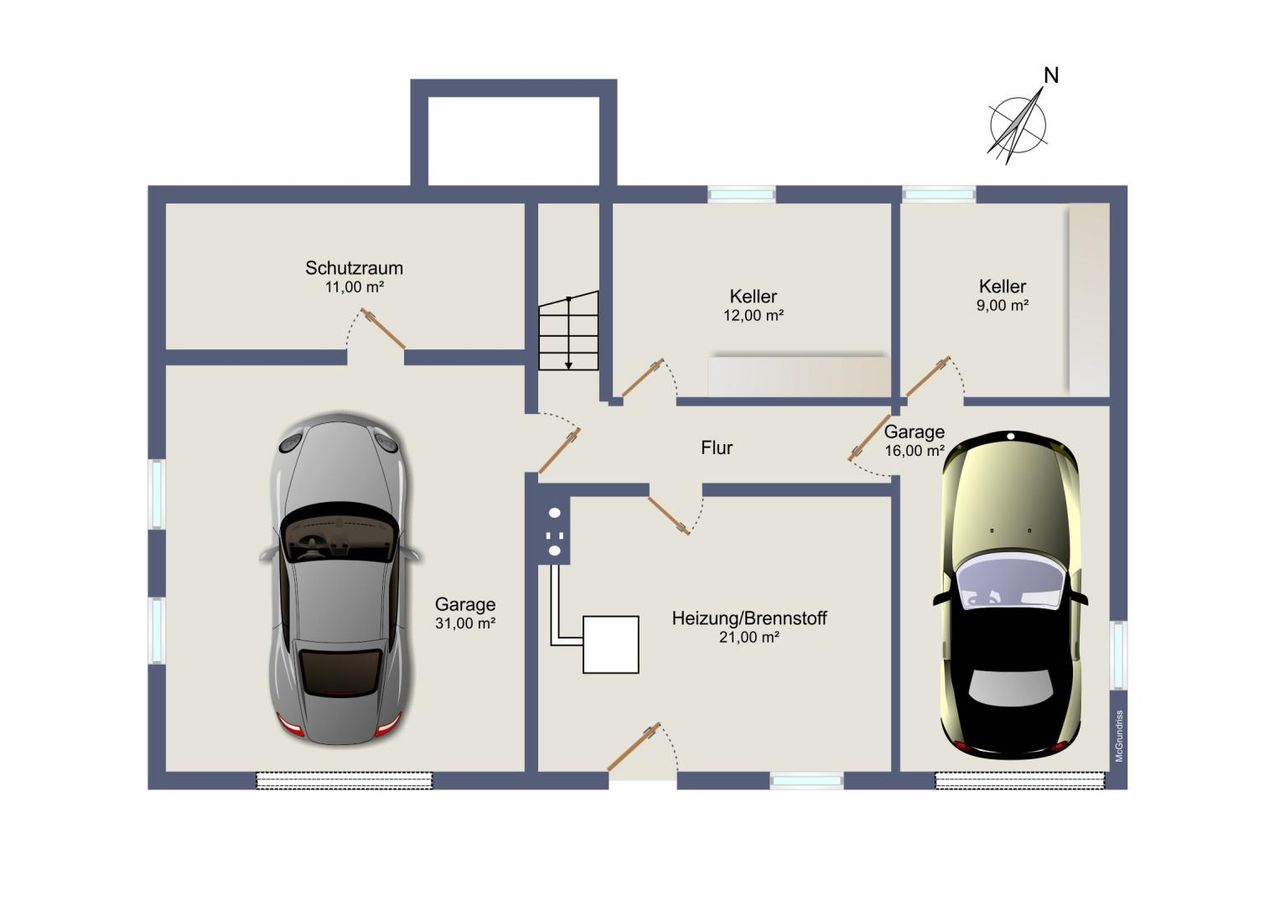 Kellergeschoss mit diversen Räumlichkeiten und Garagen